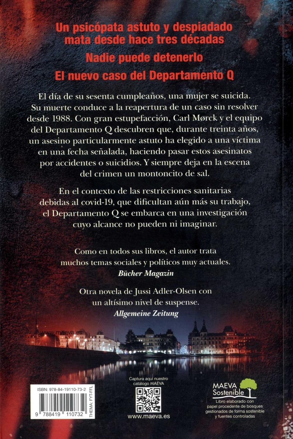 Descripción: Un psicópata astuto y despiadado mata desde hace tres décadas. Nadie puede detenerlo. El nuevo caso del Departamento Q. El día de su sesenta cumpleaños, una mujer se suicida. Su muerte conduce a la reapertura de un caso sin resolver desde 1988. Con gran estupefacción, Carl Mørck y el equipo del Departamento Q descubren que, durante treinta años, un asesino particularmente astuto ha elegido a una víctima en una fecha señalada, haciendo pasar el asesinato por un accidente o un suicidio. Y siempre deja en la escena del crimen un montoncito de sal. En el contexto de las restricciones sanitarias debidas al covid-19, que dificultan aún más su trabajo, el Departamento Q se embarca en una investigación cuyo alcance no pueden ni imaginar. ¿Por qué leer cloruro de sodio?. Es el caso más complejo que investiga el Departamento Q y tiene implicaciones muy personales para Carl Mørck. Los miembros del Departamento Q evolucionan y su relación se reafirma en este caso tan difícil.