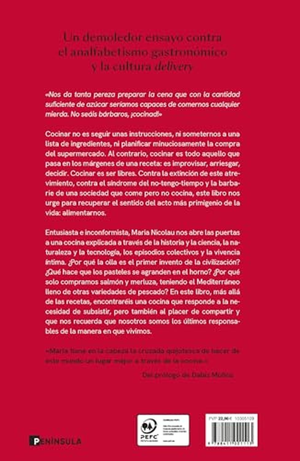 Entusiasta e inconformista, Maria Nicolau nos abre las puertas a una cocina rica, sostenible, apasionada y, sobre todo, coherente. Una cocina explicada a través de la historia y la ciencia, la naturaleza y la tecnología, los episodios colectivos y la vivencia íntima. ¿Por qué la olla es el primer invento de la civilización? ¿Qué hace que los pasteles se agranden en el horno? ¿Por qué solo compramos salmón y merluza, teniendo el Mediterráneo lleno de otras variedades de pescado? En este libro, más allá de las recetas, encontraréis una cocina que responde a la necesidad de subsistir, pero también al placer de compartir y que nos recuerda que nosotros somos los últimos responsables de la manera en que vivimos.