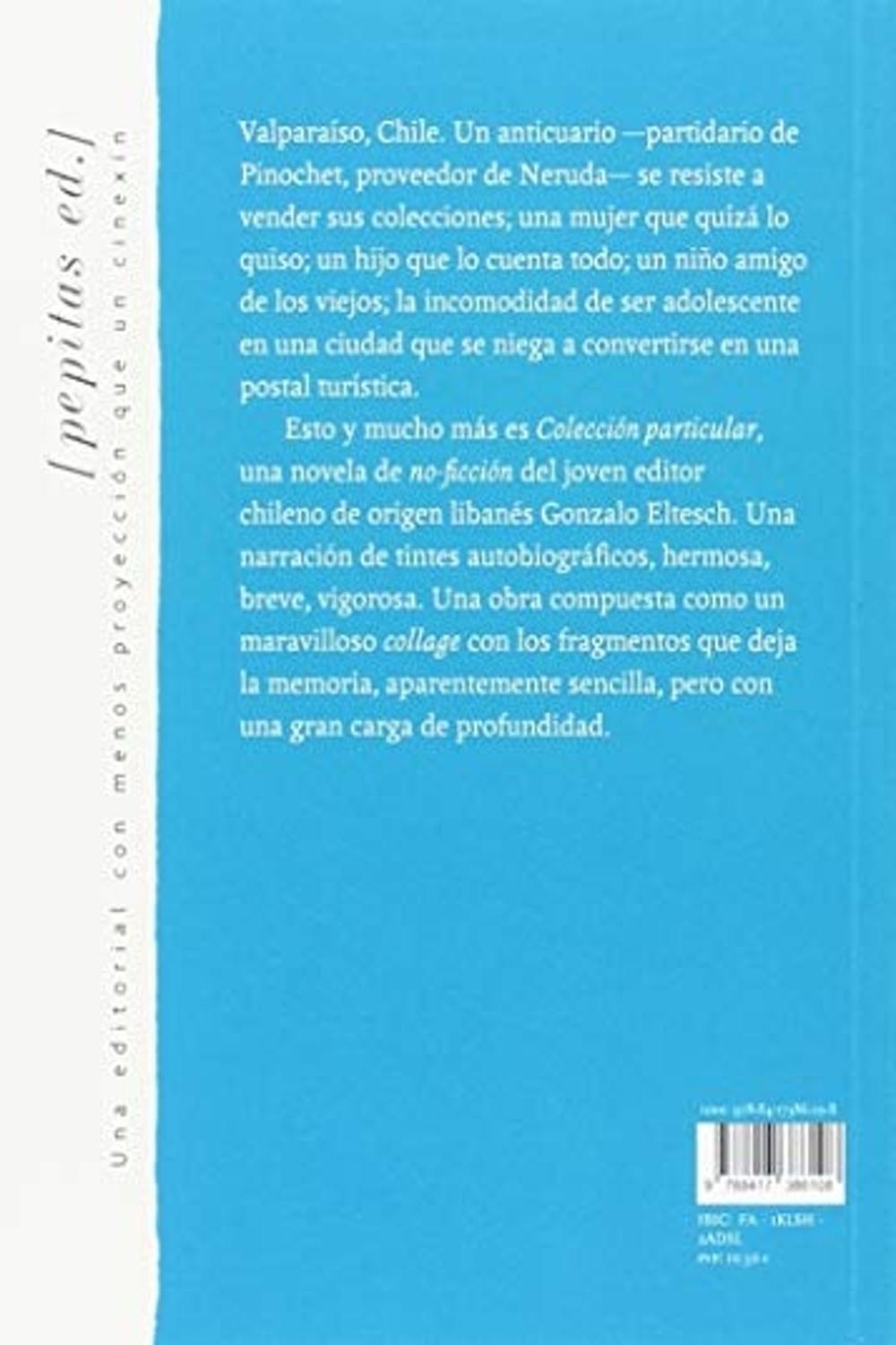 Descripción: Valparaíso, Chile. Un anticuario -partidario de Pinochet, proveedor de Neruda- se resiste a vender sus colecciones; una mujer que quizá lo quiso; un hijo que lo cuenta todo; un niño amigo de los viejos; y la incomodidad de ser adolescente en una ciudad que se niega a convertirse en una postal turística…Esto y mucho más es Colección particular, una novela de no-ficción del joven editor chileno de origen libanés Gonzalo Eltesch.