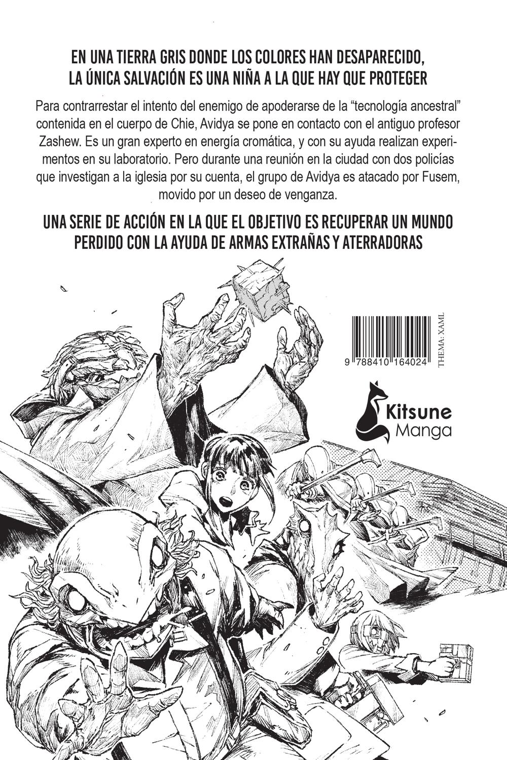 Descripción: En una Tierra gris donde los colores han desaparecido, la única salvación es una niña a la que hay que proteger Para contrarrestar el intento del enemigo de apoderarse de la tecnología ancestral contenida en el cuerpo de TChie, Avidya se pone en contacto con el antiguo profesor Zashew. Es un gran experto en energía cromática, y con su ayuda realizan experimentos en su laboratorio. Pero durante una reunión en la ciudad con dos policías que investigan a la iglesia por su cuenta, el grupo de Avidya es atacado por Fusem, movido por un desea o de venganza Una serie de acción en la que el objetivo es recuperar un mundo perdido con la ayuda de armas extrañas y aterradoras.