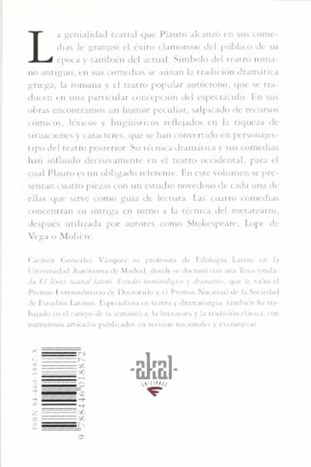Descripción: La genialidad teatral que Plauto (comediógrafo romano del siglo III a.C.) alcanzó en sus comedias le granjeó el éxito clamoroso del público de su época y también del actual. Símbolo del teatro romano antiguo, en sus comedias se aúnan la tradición dramática griega, la romana y el teatro popular autóctono, que se traducen en una particular concepción del espectáculo. En sus obras encontramos un humor peculiar, salpicado de recursos cómicos, léxicos y lingüísticos reflejados en la riqueza de situaciones y caracteres, que se han convertido en personajes-tipo del teatro posterior. Su técnica dramática y sus comedias han influido decisivamente en el teatro occidental, para el cual Plauto es un obligado referente. En este volumen se presentan cuatro piezas con un estudio novedoso de cada una de ellas que sirve como guía de lectura. Las cuatro comedias concentran su intriga en torno a la técnica del metateatro, después utilizada por Shakespeare, Lope de Vega o Moliere.