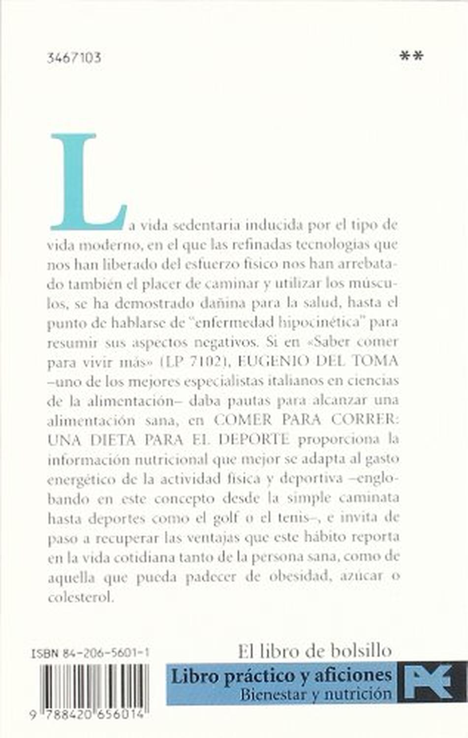 La vida sedentaria inducida por el tipo de vida moderno, en el que las refinadas tecnologías que nos han liberado del esfuerzo físico nos han arrebatado también el placer de caminar y utilizar los músculos, se ha demostrado dañina para la salud, hasta el punto de hablarse de ³enfermedad hipocinética² para resumir sus aspectos negativos. Si en «Saber comer para vivir más» (LP 7102), EUGENIO DEL TOMA uno de los mejores especialistas italianos en ciencias de la alimentación daba pautas para alcanzar una alimentación sana, en COMER PARA CORRER: UNA DIETA PARA EL DEPORTE proporciona la información nutricional que mejor se adapta al gasto energético de la actividad física y deportiva englobando en este concepto desde la simple caminata hasta deportes como el golf o el tenis, e invita de paso a recuperar las ventajas que este hábito reporta en la vida cotidiana tanto de la persona sana, como de aquella que pueda padecer de obesidad, azúcar o colesterol.