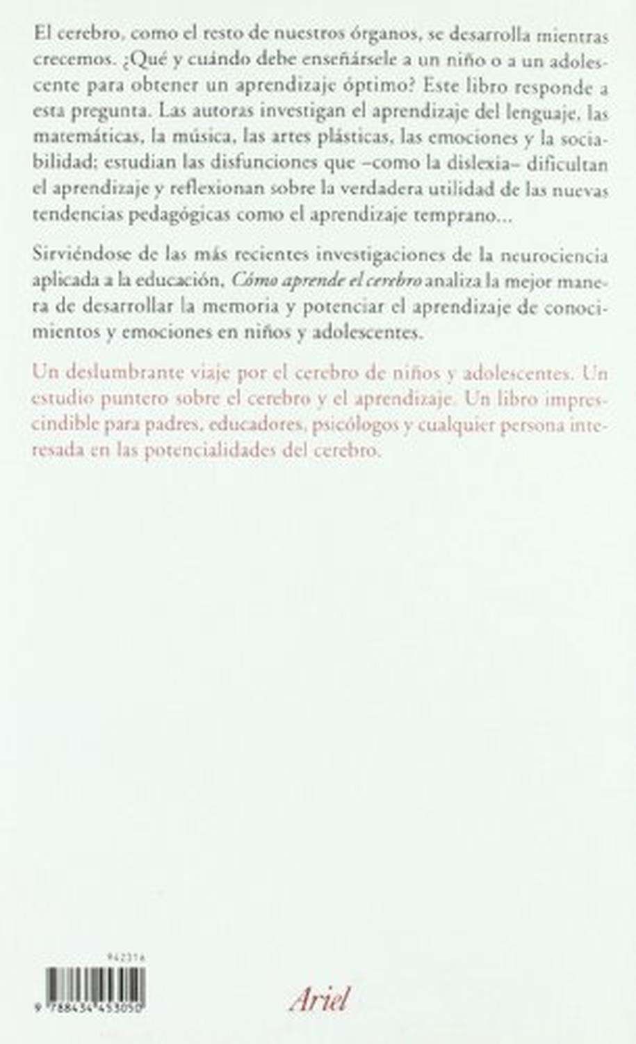 El cerebro, como el resto de nuestros órganos, se desarrolla mientras crecemos. ¿Qué y cuándo debe enseñársele a un niño o a un adolescente para obtener un aprendizaje óptimo? Este libro responde a esta pregunta. Las autoras investigan el aprendizaje del lenguaje, las matemáticas, la música, las artes plásticas, las emociones y la sociabilidad; estudian las disfunciones que –como la dislexia- dificultan el aprendizaje y reflexionan sobre la verdadera utilidad de las nuevas tendencias pedagógicas como el aprendizaje temprano.... Sirviéndose de las más recientes investigaciones de la neurociencia aplicada a la educación Cómo aprende el cerebro analiza la mejor manera de desarrollar la memoria y potenciar el aprendizaje de conocimientos y emociones en niños y adolescentes. Un deslumbrante viaje por el cerebro de niños y adolescentes. Un estudio puntero sobre el cerebro y el aprendizaje. Un libro imprescindible para padres, educadores, psicólogos y cualquier persona interesada en las potencialidades del cerebro.