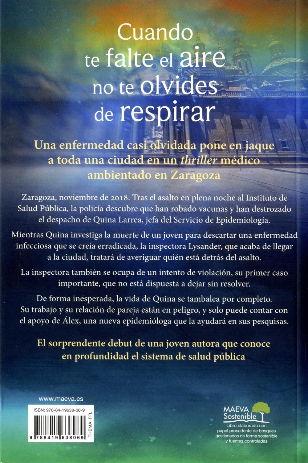 Descripción: Una enfermedad casi olvidada que pone en jaque a toda una ciudad en un thriller médico ambientado en Zaragoza. El sorprendente debut de una joven autora que conoce en profundidad el sistema de salud pública. Zaragoza, noviembre de 2018. Tras el asalto en plena noche al Instituto de Salud Pública, la policía descubre que han robado una serie de vacunas y han destrozado el despacho de Quina Larrea, jefa del Servicio de Epidemiología. Mientras Quina investiga la muerte de un joven para descartar una enfermedad infecciosa que se creía erradicada, la inspectora Lysander tratará de averiguar quién está detrás del asalto. A partir de ese momento, la vida de Quina se tambalea y solo puede contar con el apoyo de Álex, una nueva epidemióloga que la ayudará en sus pesquisas.
