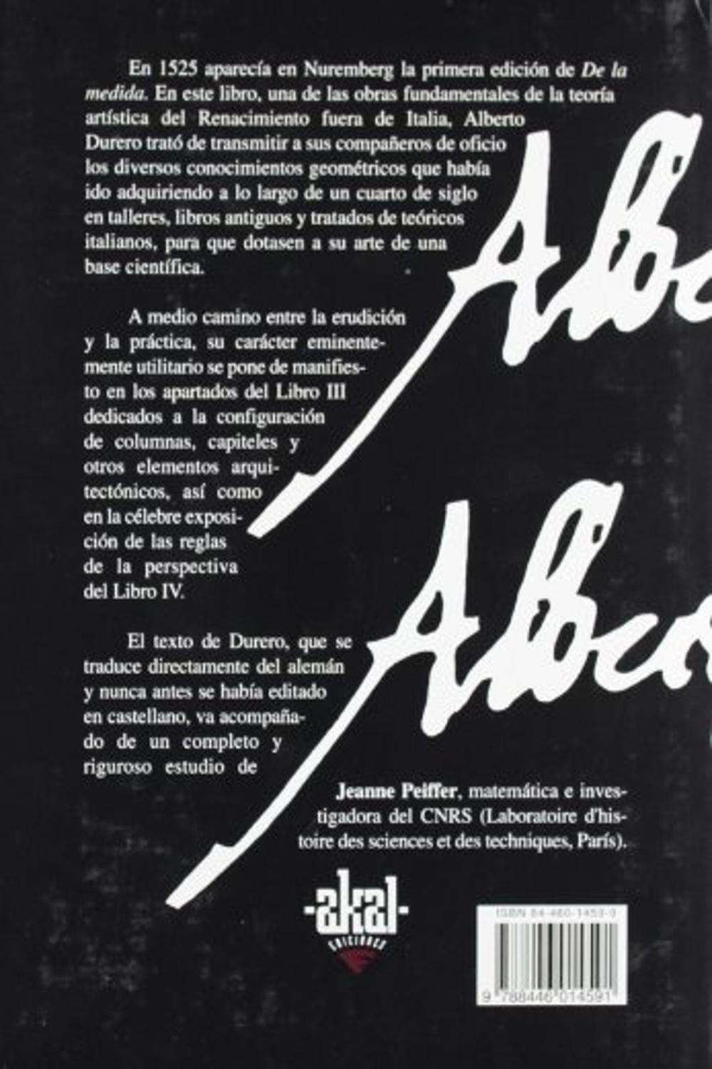 Descripción: A medio camino entre la erudición y la práctica, el libro del gran pintor alemán del Renacimiento Alberto Durero enseña el modo de construir correctamente distintos tipos de líneas, planos y cuerpos geométricos que luego el artista lo podrá utilizar en sus obras. Además de los contenidos de índole puramente matemática, tienen especial importancia los apartados que dedica a la arquitectura ,configuración de columnas, capiteles- y la pintura, con una exposición de las leyes de la perspectiva.