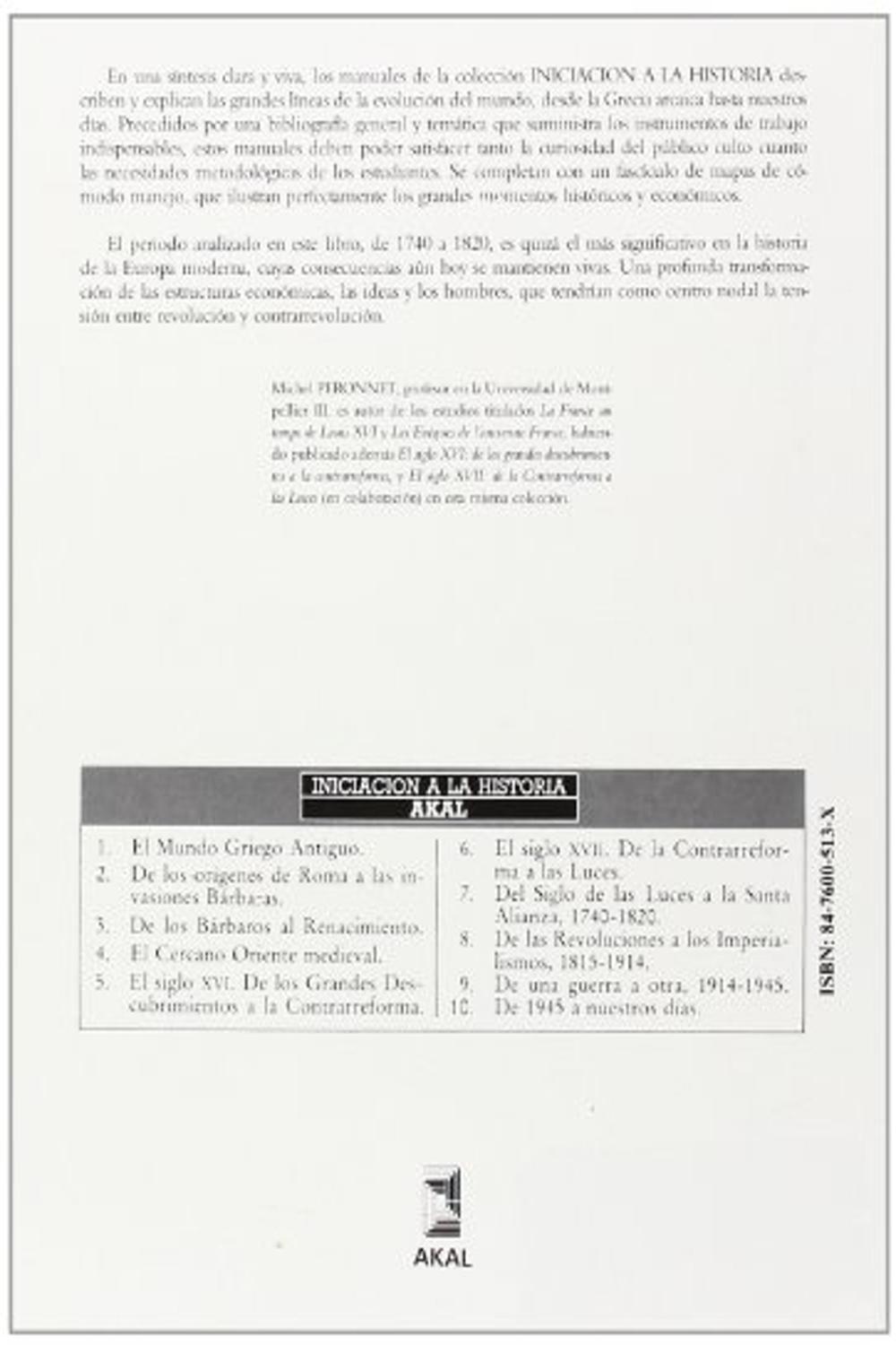 Descripción: En una síntesis clara y viva, los manuales de la colección INICIACIÓN A LA HISTORIA describen y explican las grandes líneas de la evolución del mundo, desde la Grecia arcaica hasta nuestros días. Precedidos por una bibliografía general y temática que suministra los instrumentos de trabajo indispensables, estos manuales deben poder satisfacer tanto la curiosidad del público culto como las necesidades metodológicas de los estudiantes. Se completan con un fascículo de mapas de cómodo manejo, que ilustran perfectamente los grandes momentos históricos y económicos. El periodo analizado en este libro, de 1740 a 1820, es quizá el más significativo en la historia de la Europa moderna, cuyas consecuencias aún hoy se mantienen vivas. Una profunda transformación de las estructuras económicas, las ideas y los hombres, que tendrían como centro nodal la tensión entre revolución y contrarrevolución.