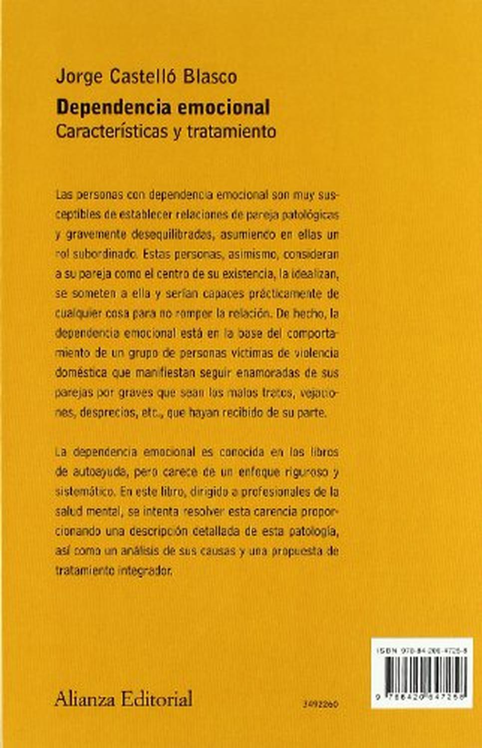 Reseña del editor Las personas con dependencia emocional son muy susceptibles de establecer relaciones de pareja patológicas y gravemente desequilibradas, asumiendo en ellas un rol subordinado. Estas personas, asimismo, consideran a su pareja como el centro de su existencia, la idealizan, se someten a ella y serían capaces prácticamente de cualquier cosa para no romper la relación. De hecho, la dependencia emocional está en la base del comportamiento de un grupo de personas víctimas de violencia doméstica, que manifiestan seguir enamoradas de sus parejas por graves que sean los malos tratos, vejaciones, desprecios, etc. que hayan recibido de su parte. La dependencia emocional es conocida en los libros de autoayuda, pero carece de un enfoque riguroso y sistemático. En este libro, dirigido a profesionales de la salud mental, se intenta resolver esta carencia proporcionando una descripción detallada de esta patología, así como un análisis de sus causas y una propuesta de tratamiento integrador. Biografía del autor Jorge Castelló Blasco es psicólogo y ejerce su actividad como psicoterapeuta en Valencia, especializado en trastornos de la personalidad. Es autor de diferentes artículos y ponencias, así como docente en cursos presenciales y en línea dedicados a la formación para profesionales de la salud mental. Sus principales trabajos tratan sobre la dependencia emocional, terreno que empezó a abordar de forma rigurosa en 1999 con la participación en el pionero I Congreso Virtual de Psiquiatría, y que ha sido el tema de dos de sus libros: "Dependencia emocional: características y tratamiento" (Alianza Editorial, 2005) y "La superación de la dependencia emocional" (2012).