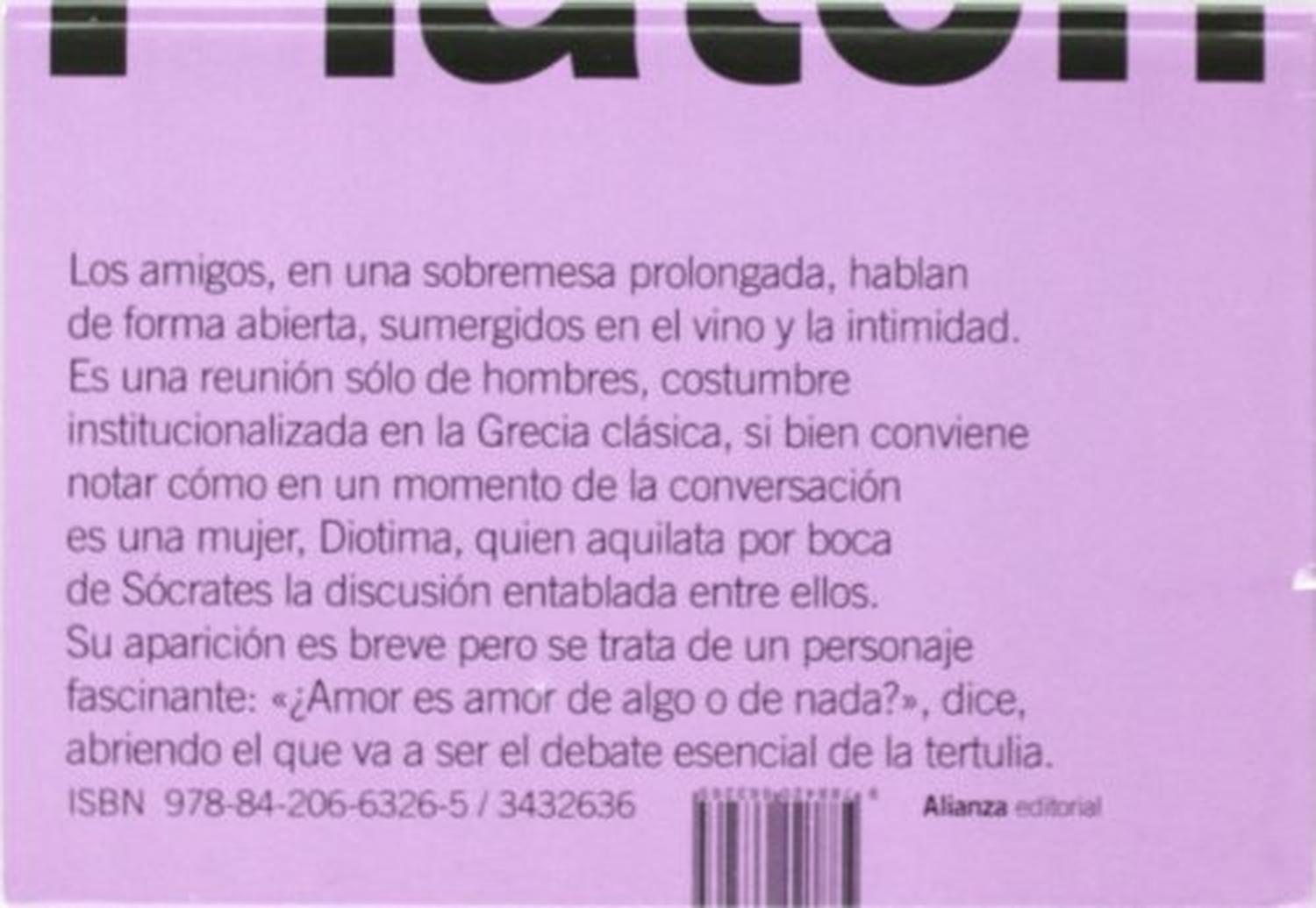 En su ensayo de referencia titulado Por qué leer a los clásicos, Italo Calvino dejó escrito que «los clásicos son libros que cuanto más se cree uno conocerlos de oídas, tanto más nuevos, inesperados, insólitos resultan al leerlos de verdad». Dentro de los clásicos se hallan, claro está, los primeros de nuestra tradición cultural, los procedentes de las antiguas Grecia y Roma. ¡Clásicos! es una serie de diseño y manufactura exquisitos, con la que Alianza Editorial quiere poner al alcance del lector del siglo XXI textos de los que sin duda habrá oído hablar pero que quizás, tradicionalmente lastrados por una pesada carga de erudición filológica, nunca se había atrevido a abordar. Las ediciones, que ofrecen textos íntegros en traducciones solventes y que reducen las notas al mínimo imprescindible, están presentadas por personajes alejados del ámbito académico -actores, escritores, pensadores, políticos, científicos...- que aportan con su visión un toque de frescura, perspectivas originales para el lector de hoy. EL BANQUETE Los amigos, en una sobremesa prolongada, hablan de forma abierta, sumergidos en el vino y la intimidad. Es una reunión sólo de hombres, costumbre institucionalizada en la Grecia clásica, si bien conviene notar cómo en un momento de la conversación es una mujer, Diotima, quien aquilata por boca de Sócrates la discusión entablada entre ellos. Su aparición es breve pero se trata de un personaje fascinante: «¿Amor es amor de algo o de nada?», dice, abriendo el que va a ser el debate esencial de la tertulia.