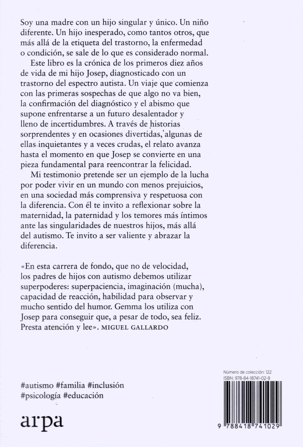 Descripción: Una historia de superación sobre la sacudida que supone la irrupción imprevista del autismo en la vida familiar. Soy una madre con un hijo singular y único. Un niño diferente. Un hijo inesperado, como tantos otros, que más allá de la etiqueta del trastorno, la enfermedad o condición, se sale de lo que es considerado normal. Este libro es la crónica de los primeros diez años de vida de mi hijo Josep, diagnosticado con un trastorno del espectro autista. Un viaje que comienza con las primeras sospechas de que algo no va bien, la confirmación del diagnóstico y el abismo que supone enfrentarse a un futuro desalentador y lleno de incertidumbres. A través de historias sorprendentes y en ocasiones divertidas, algunas de ellas inquietantes y a veces crudas, el relato avanza hasta el momento en que Josep se convierte en una pieza fundamental para reencontrar la felicidad.