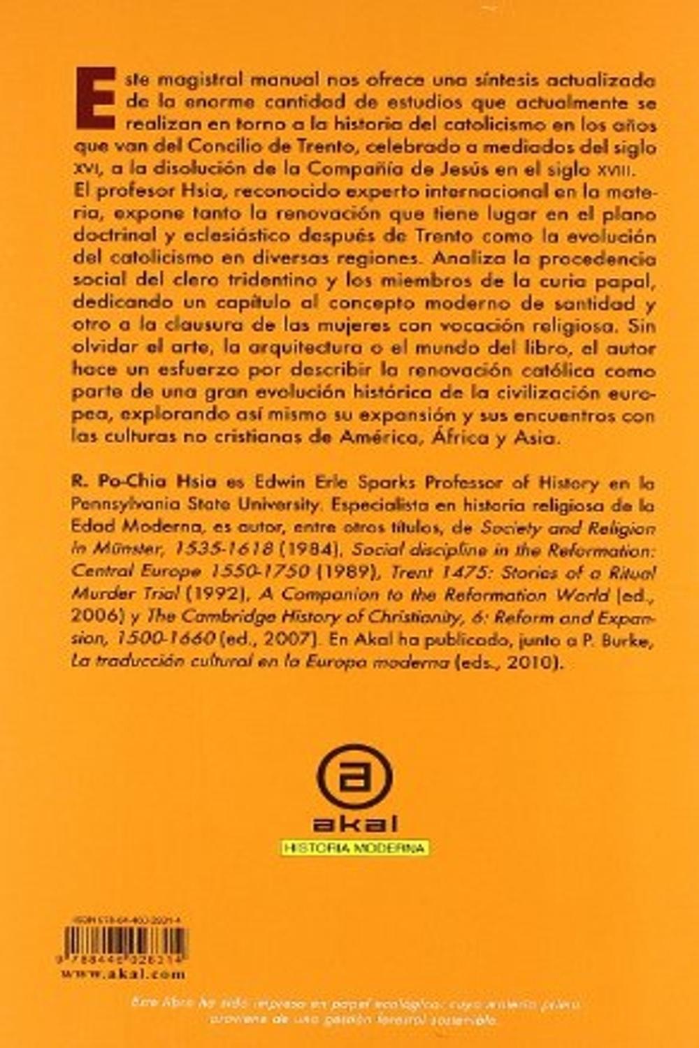 Descripción: Este magistral manual nos ofrece una síntesis actualizada de la enorme cantidad de estudios que actualmente se realizan en torno a la historia del catolicismo en los años que van del Concilio de Trento, celebrado a mediados del siglo XVI, a la disolución de la Compañía de Jesús en el siglo XVIII. El profesor Hsia, reconocido experto internacional en la materia, expone tanto la renovación que tiene lugar en el plano doctrinal y eclesiástico después de Trento como la evolución del catolicismo en diversas regiones. Analiza la procedencia social del clero tridentino y los miembros de la curia papal, dedicando un capítulo al concepto moderno de santidad y otro a la clausura de las mujeres con vocación religiosa. Sin olvidar el arte, la arquitectura o el mundo del libro, el autor hace un esfuerzo por describir la renovación católica como parte de una gran evolución histórica de la civilización europea, explorando así mismo su expansión y sus encuentros con las culturas no cristianas de América, África y Asia.