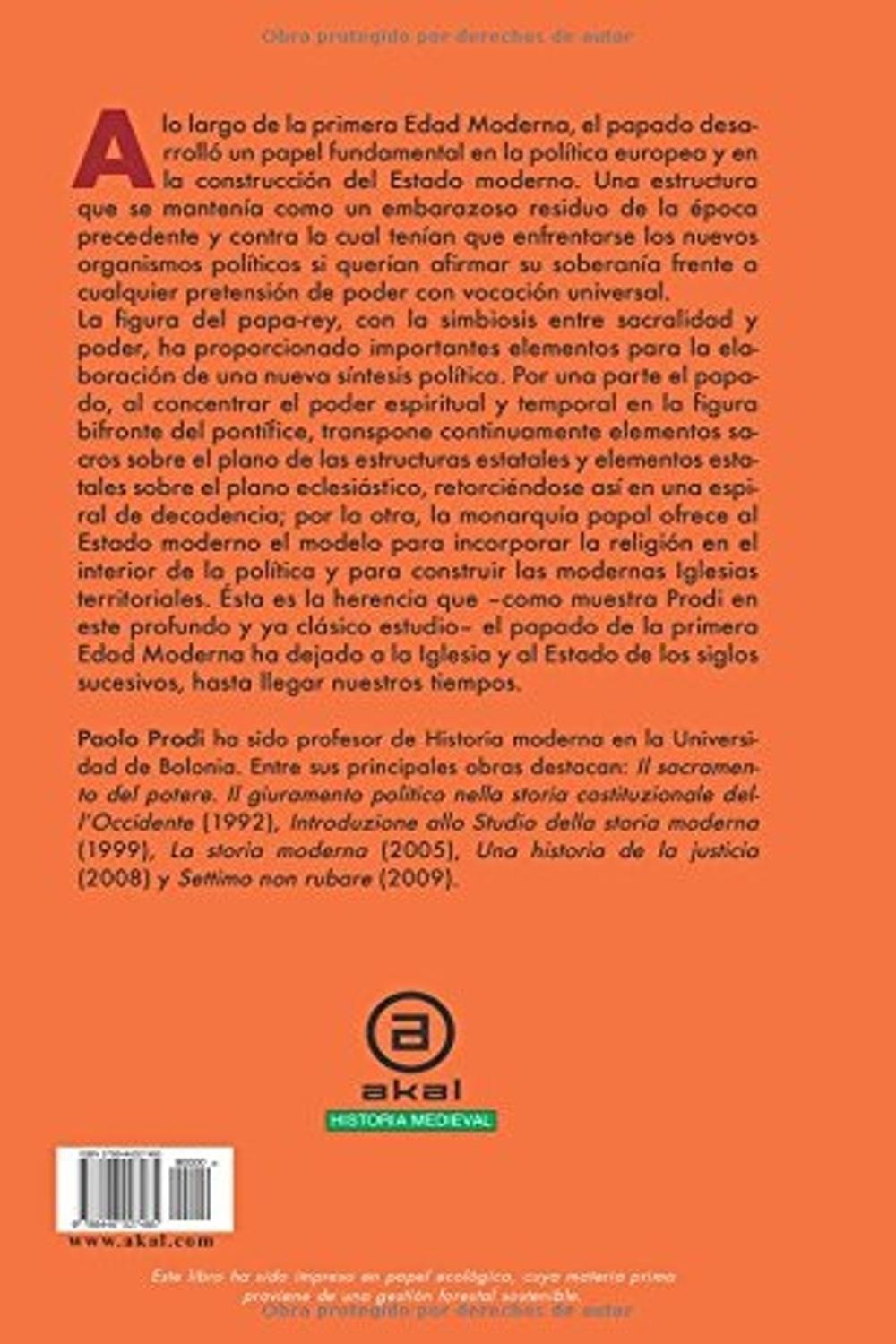 Descripción: A lo largo de la primera Edad Moderna, el papado desarrolló un papel fundamental en la política europea y en la construcción del Estado moderno. Una estructura que se mantenía como un embarazoso residuo de la época precedente y contra la cual tuvieron que enfrentarse los nuevos organismos políticos si querían afirmar su soberanía delante de cualquier pretensión de poder con vocación universal. La figura del papa-rey, con la simbiosis entre sacralidad y poder, ha proporcionado importantes elementos para la elaboración de una nueva síntesis política. Si por una parte el papado, al concentrar el poder espiritual y temporal en la figura bifronte del pontífice, transpone continuamente elementos sacros sobre el plano de las estructuras estatales y elementos estatales sobre el plano eclesiástico, retorciéndose así en una espiral de decadencia. por la otra, la monarquía papal ofrece al Estado moderno el modelo para incorporar la religión en el interior de la política y para construir las modernas Iglesias territoriales. Ésta es la herencia que ,como muestra Prodi en este brillante y ya clásico estudio. el papado de la primera Edad Moderna ha dejado a la Iglesia y al Estado de los siglos sucesivos, hasta nuestros tiempos.
