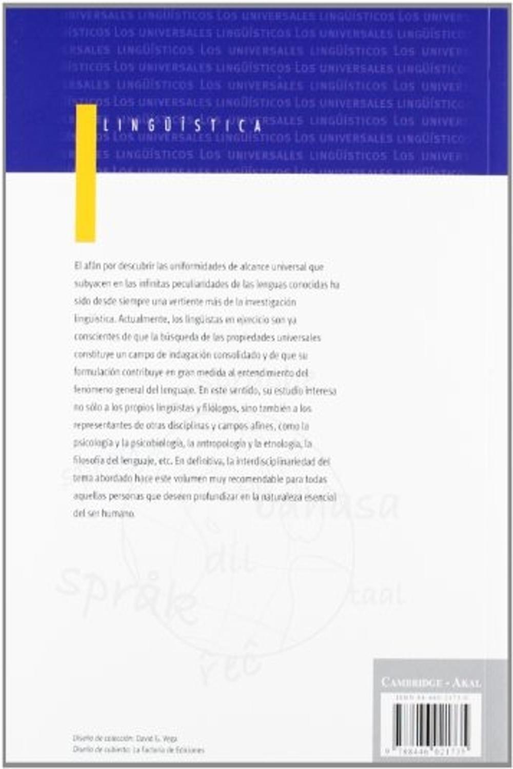Descripción: El afán por descubrir las uniformidades de alcance universal que subyacen en las infinitas peculiaridades de las lenguas conocidas ha sido desde siempre una vertiente más de la investigación lingüística. Actualmente, los lingüistas en ejercicio son ya conscientes de que la búsqueda de las propiedades universales constituye un campo de indagación consolidado y de que su formulación contribuye en gran medida al entendimiento del fenómeno general del lenguaje. En este sentido, su estudio interesa no sólo a los propios lingüistas y filólogos, sino también a los representantes de otras disciplinas y campo afines (psicología, antropología. filosofía del lenguaje...). El carácter interdisciplinar con que se trata el tema en el presente volumen lo hacen muy recomendable para todas aquellas personas que deseen profundizar en la naturaleza esencial del ser humano.