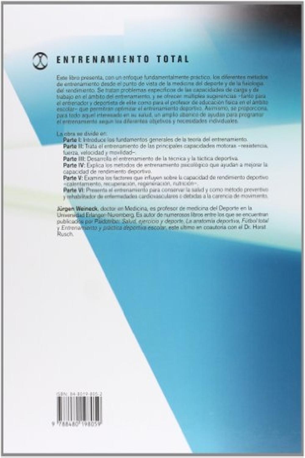 Descripción: Este libro presenta, con un enfoque fundamentalmente práctico, los diferentes métodos de entrenamiento desde el punto de vista de la medicina del deporte y de la fisiología del rendimiento. se tratan problemas específicos de las capacidades de carga y de trabajo en el ámbito de entrenamiento infantil y juvenil, y se ofrecen múltiples sugerencias –tanto para el entrenador y deportista de elite como para el profesor de educación física en el ámbito escolar– que permitirán optimizar el entrenamiento deportivo. asimismo, se proporciona, para todo aquel interesado en su salud, un amplio abanico de ayudas para programar el entrenamiento según los diferentes objetivos y necesidades individuales.brla obra se divide en:brparte i: introduce los fundamentos generales de la teoría del entrenamiento.brparte ii: trata el entrenamiento de las principales capacidades motoras –resistencia, fuerza, velocidad y movilidad–.brparte iii: desarrolla el entrenamiento de la técnica y la táctica deportiva.brparte iv: explica los métodos de entrenamiento psicológico que ayudan a mejorar la capacidad de rendimiento deportivo.brparte v: examina los factores que influyen sobre la capacidad de rendimiento deportivo –calentamiento, recuperación, regeneración, nutrición–.brparte vi: presenta el entrenamiento para conservar la salud y como método preventivo y rehabilitador de enfermedades cardiovasculares o debidas a la carencia de movimiento.brjürgen weineck, doctor en medicina, es profesor de medicina del deporte en la universidad erlangen-nuremberg. es autor de numerosos libros entre los que se encuentran publicados por paidotribo: salud, ejercicio y deporte, la anatomía deportiva, fútbol total y entrenamiento y práctica deportiva escolar, este último en coautoría con el dr. horst rusch.
