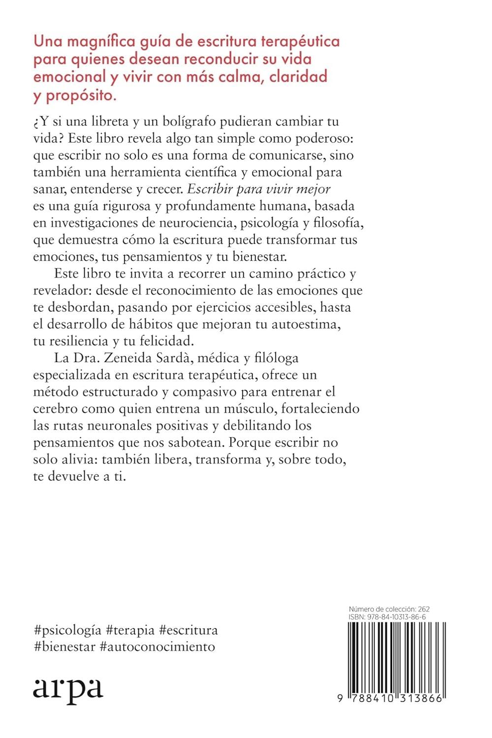 Descripción: Una guía clara y rigurosa sobre una tendencia en auge: la escritura terapéutica. Un enfoque basado en la neurociencia, la psicología y la práctica de escribir como herramienta para gestionar emociones, calmar la mente y mejorar el bienestar. ¿Y si una libreta y un bolígrafo pudieran cambiar tu vida? Este libro revela algo tan simple como poderoso: que escribir no solo es una forma de comunicarse, sino también una herramienta científica y emocional para sanar, entenderse y crecer. Escribir para vivir mejor es una guía rigurosa y profundamente humana, basada en investigaciones de neurociencia, psicología y filosofía, que demuestra cómo la escritura puede transformar tus emociones, tus pensamientos y tu bienestar. Este libro te invita a recorrer un camino práctico y revelador: desde el reconocimiento de las emociones que te desbordan, pasando por ejercicios accesibles, hasta el desarrollo de hábitos que mejoran tu autoestima, tu resiliencia y tu felicidad.