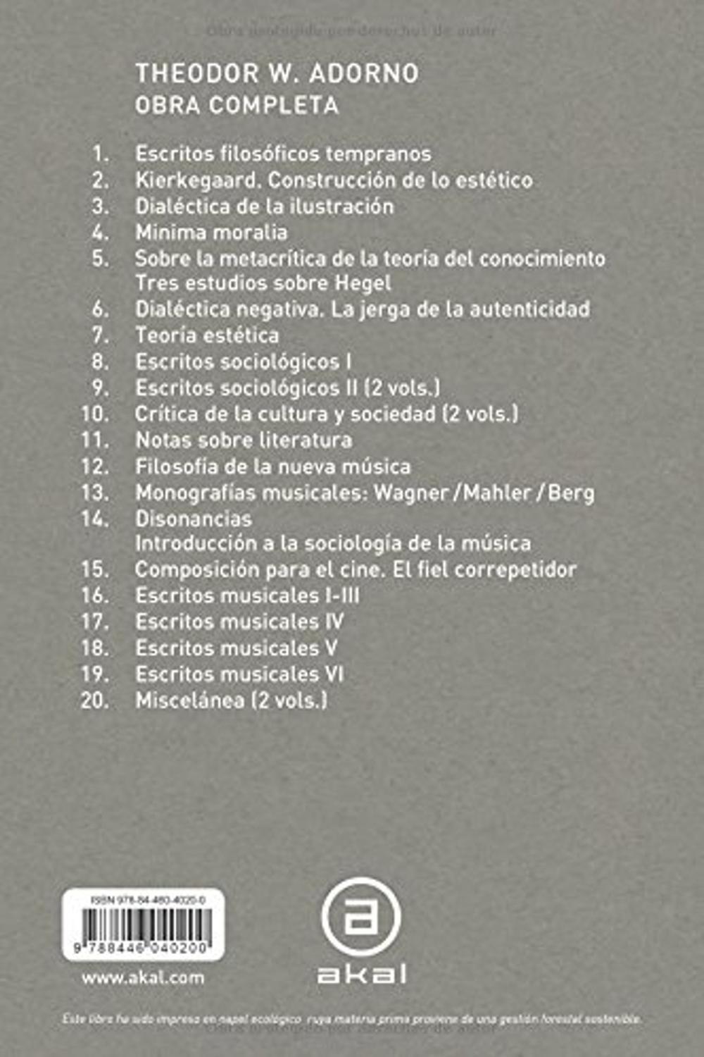 Descripción: Adorno presenta su análisis y crítica de los conciertos operísticos, las composiciones y las producciones escritas relativas al campo musical de su época con su brillantez y erudición características. Un volumen que da por concluidos los seis Escritos musicales que recoge la obra completa de Theodor W. Adorno publicada en esta colección.