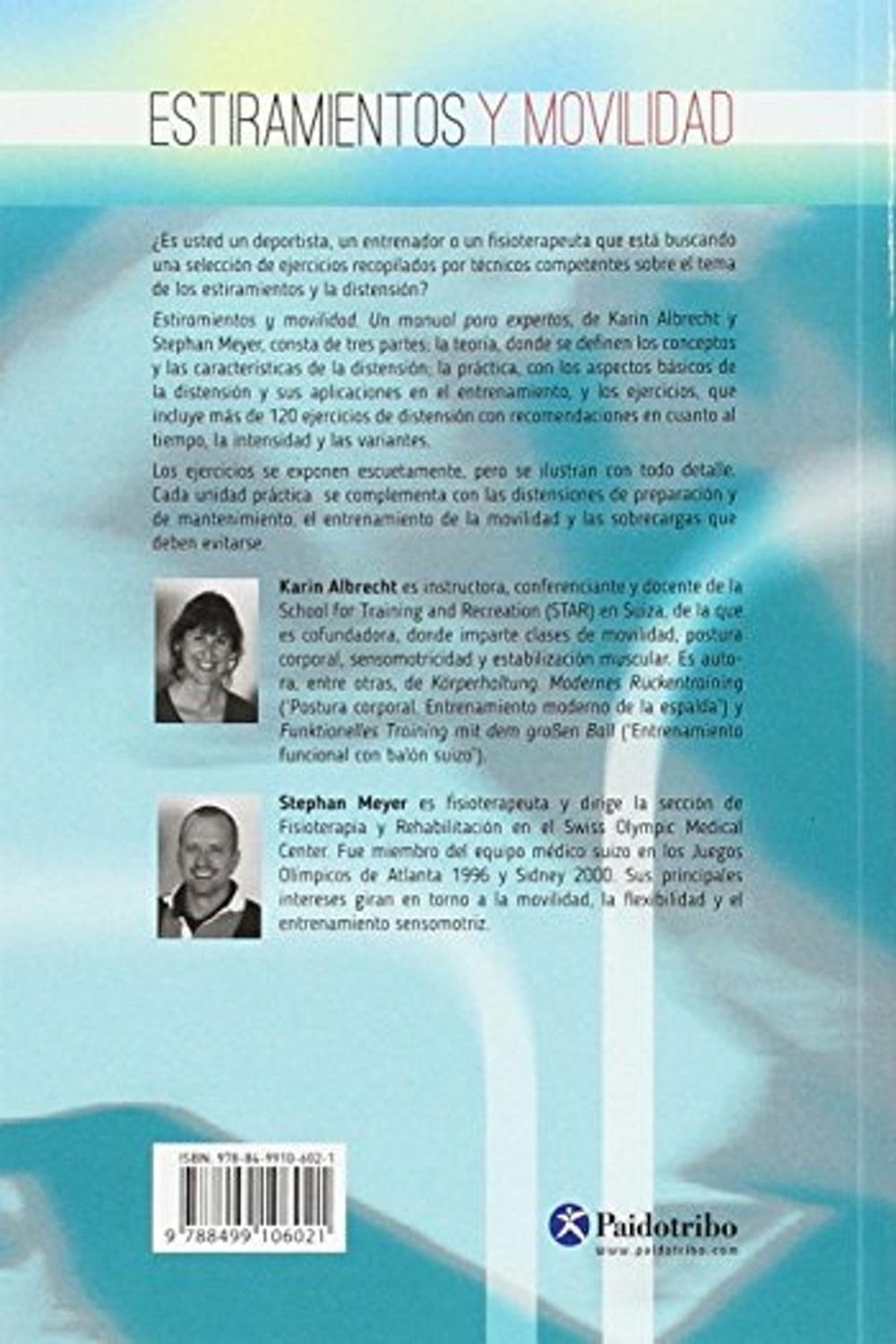 Descripción: ¿es usted un deportista, un entrenador o un fisioterapeuta que está buscando una selección de ejercicios recopilados por técnicos competentes sobre el tema de los estiramientos y la distensión? br estiramientos y movilidad. un manual para expertos, de karin albrecht y stephan meyer, consta de tres partes: la teoría, donde se ofrecen las bases anatómicas y fisiológicas de la musculatura esquelética, y se definen los conceptos y las características de la distensión, la práctica, con los aspectos básicos de la distensión y sus aplicaciones en el entrenamiento, y los ejercicios, que incluye más de 120 ejercicios de distensión con recomendaciones en cuanto al tiempo, la intensidad y las variantes. brel inicio de los movimientos, su ejecución y la posición final se exponen escuetamente, pero se ilustran con todo detalle. cada unidad de ejercicios se complementa con las distensiones de preparación y de mantenimiento, el entrenamiento de la movilidad y las sobrecargas que deben evitarse en la práctica. brestiramientos y movilidad. un manual para expertos es un libro que presenta los estiramientos y la movilidad desde un punto de vista global. es una obra ideal para el deportista que desee mantener o mejorar su rendimiento y quiera prevenir las limitaciones de la movilidad.
