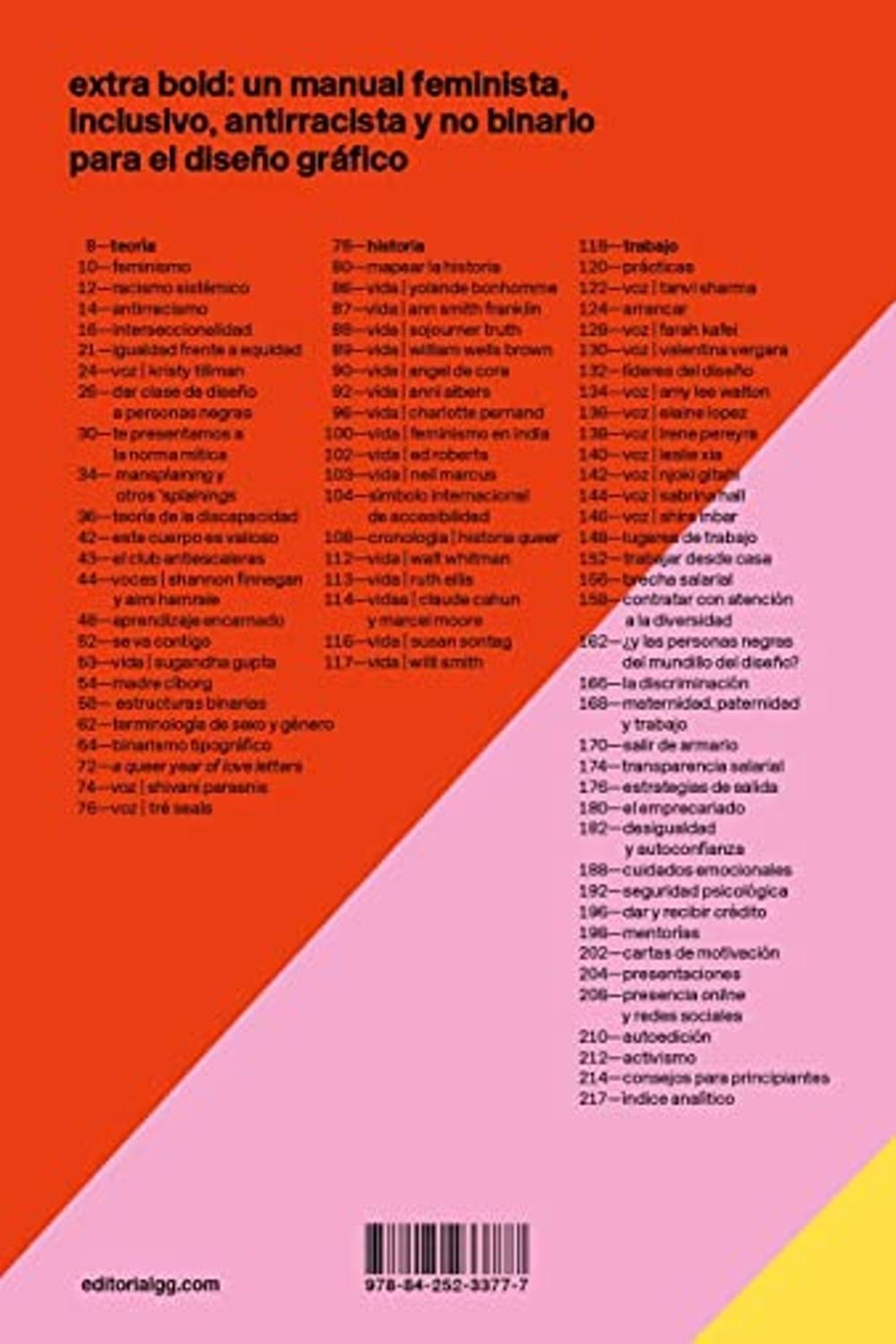 Descripción: Extra Bold es un manual de diseño pensado para todas y todos. Parte ensayo y parte cómic, fanzine, manifiesto y guía de supervivencia, este maravilloso libro está repleto de historias e ideas nunca antes vistas en un libro de diseño. Escrito de forma colaborativa por un variado grupo de autoras y autores, Extra Bold comienza con diversos ensayos que conectan el diseño con el pensamiento feminista, inclusivo, antirracista y no binario. Sus historias abren el diseño a nuevas personas y prácticas hasta ahora pasadas por alto. Las entrevistas, los juegos tipográficos y los proyectos que encontrarás en él nos brindan múltiples puntos de vista, pues sus creadoras y creadores conforman un variado mosaico de habilidades, identidades de género y orígenes raciales y étnicos. Tan práctico como informativo, Extra Bold es una exploración de las estructuras de poder y del modo como podemos navegar por ellas. En las entrevistas conoceremos a personas en distintas fases de su carrera profesional, y en las biografías relatadas descubriremos la vida y el trabajo de aquellas creativas y creativos que fueron marginados por su sexo, raza o discapacidades. Todo ello acompañado por las ilustraciones de Jennifer Tobias, que aportan calidez y profundidad narrativa a cada una de las secciones del libro.