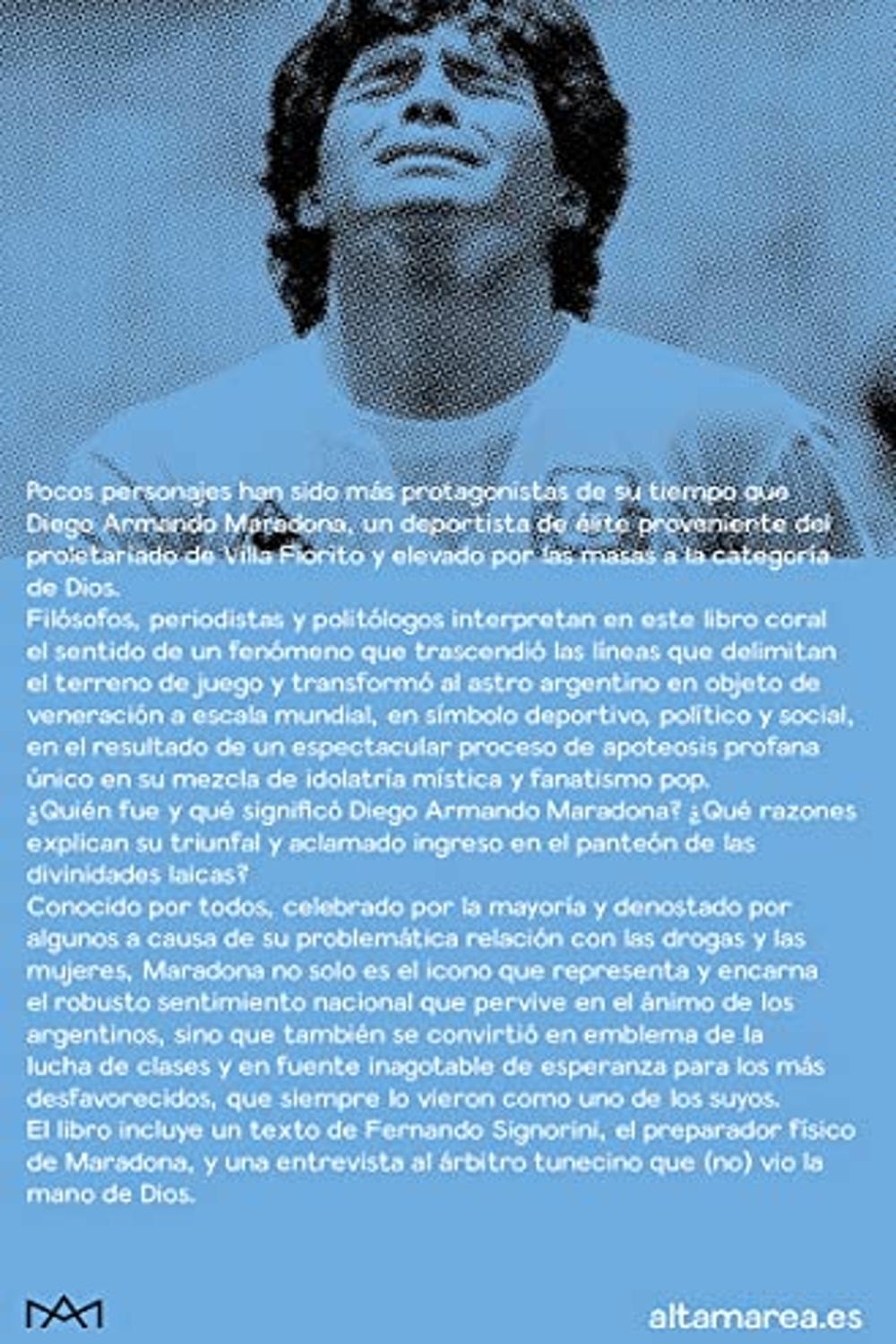 Descripción: Pocos personajes han sido más protagonistas de su tiempo que Diego Armando Maradona, un deportista de élite proveniente del proletariado de Villa Fiorito y elevado por las masas a la categoría de Dios. Filósofos, periodistas y politólogos interpretan en este libro coral el sentido de un fenómeno que trascendió las líneas que delimitan el terreno de juego y transformó al astro argentino en objeto de veneración a escala mundial, en símbolo deportivo, político y social, en el resultado de un espectacular proceso de apoteosis profana único en su mezcla de idolatría mística y fanatismo pop.¿Quién fue y qué significó Diego Armando Maradona? ¿Qué razones explican su triunfal y aclamado ingreso en el panteón de las divinidades laicas? Conocido por todos, celebrado por la mayoría y denostado por algunos a causa de su problemática relación con las drogas y las mujeres, Maradona no solo es el icono que representa y encarna el robusto sentimiento nacional que pervive en el ánimo de los argentinos, sino que también se convirtió en emblema de la lucha de clases y en fuente inagotable de esperanza para los más desfavorecidos, que siempre lo vieron como uno de los suyos. El libro incluye un texto de Fernando Signorini, histórico preparador físico de Maradona, y una entrevista al árbitro tunecino que (no) vio la mano de Dios.