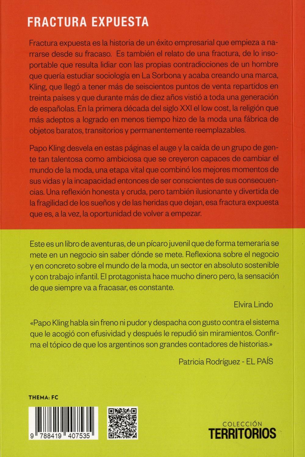 Descripción: Fractura expuesta es la historia de un éxito empresarial que empieza a narrarse desde su fracaso. Es también el relato de una fractura, de lo insoportable que resulta lidiar con las propias contradicciones de un hombre que quería estudiar sociología en La Sorbona y acaba creando una marca, Kling, que llegó a tener más de seiscientos puntos de venta repartidos en treinta países y que durante más de diez años vistió a toda una generación de españolas. En la primera década del siglo XXI el low cost, la religión que más adeptos a logrado en menos tiempo hizo de la moda una fábrica de objetos baratos, transitorios y permanentemente reemplazables. Papo Kling desvela en estas páginas el auge y la caída de un grupo de gente tan talentosa como ambiciosa que se creyeron capaces de cambiar el mundo de la moda, una etapa vital que combinó los mejores momentos de sus vidas y la incapacidad entonces de ser conscientes de sus consecuencias.