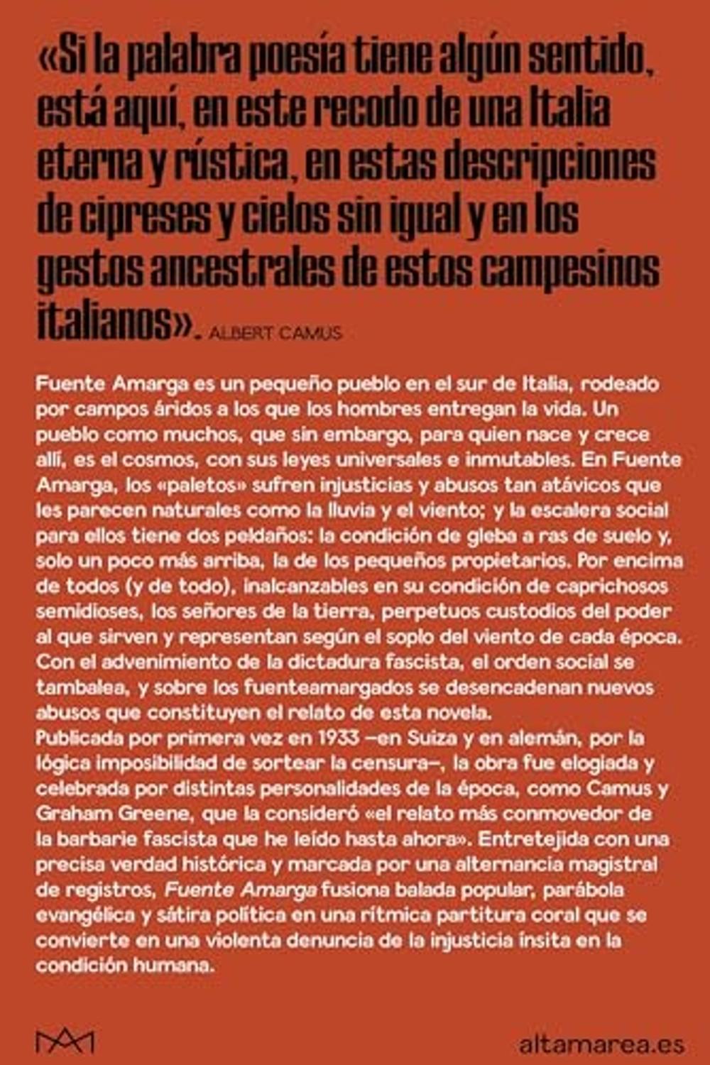 Descripción: Fuente Amarga es un pequeño pueblo en el sur de Italia, rodeado por campos áridos a los que los hombres entregan la vida. Un pueblo como muchos, que sin embargo, para quien nace y crece allí, es el cosmos, con sus leyes universales e inmutables. En Fuente Amarga, los «paletos» sufren injusticias y abusos tan atávicos que les parecen naturales como la lluvia y el viento; y la escalera social para ellos tiene dos peldaños: la condición de gleba a ras de suelo y, solo un poco más arriba, la de los pequeños propietarios. Por encima de todos (y de todo), inalcanzables en su condición de caprichosos semidioses, los señores de la tierra, perpetuos custodios del poder al que sirven y representan según el soplo del viento de cada época. Con el advenimiento de la dictadura fascista, el orden social se tambalea, y sobre los fuenteamargados se desencadenan nuevos abusos que constituyen el relato de esta novela.