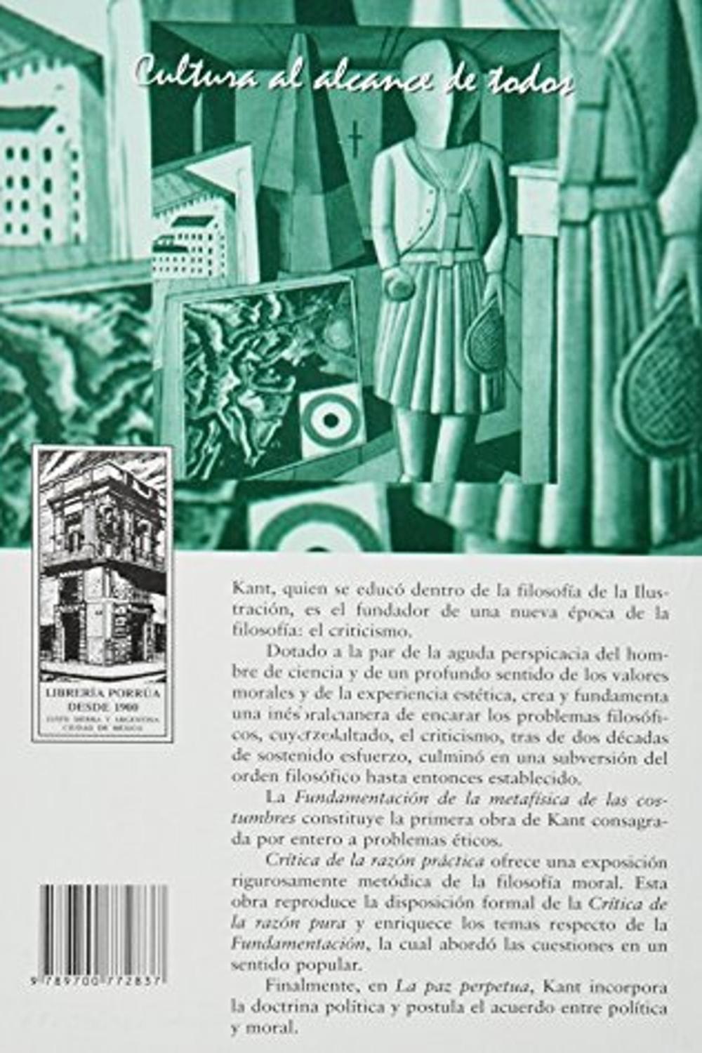 Descripción: Kant, quien se educó dentro del pensamiento de la Ilustración, es el fundador de una nueva época de la filosofía: el criticismo. Dotado a la par de la aguda perspicacia del hombre de ciencia y de un profundo sentido de los valores morales y de la experiencia estética, creó y fundamentó una inédita manera de encarar los problemas filosóficos, cuyo resultado, el criticismo, tras de dos décadas de sostenido esfuerzo, significó la subversión del orden filosófico hasta entonces establecido. La Fundamentación de la metafísica de las costumbres constituye la primera obra de Kant consagrada por entero a problemas éticos. Crítica de la razón práctica ofrece una exposición rigurosamente metódica de la filosofía moral. Este tratado reproduce la disposición formal de la Crítica de la razón pura y enriquece los temas respecto de la Fundamentación, la cual aborda las cuestiones en un sentido popular. Finalmente, en La paz perpetua, el filósofo prusiano incorpora la doctrina política y postula el acuerdo entre política y moral.