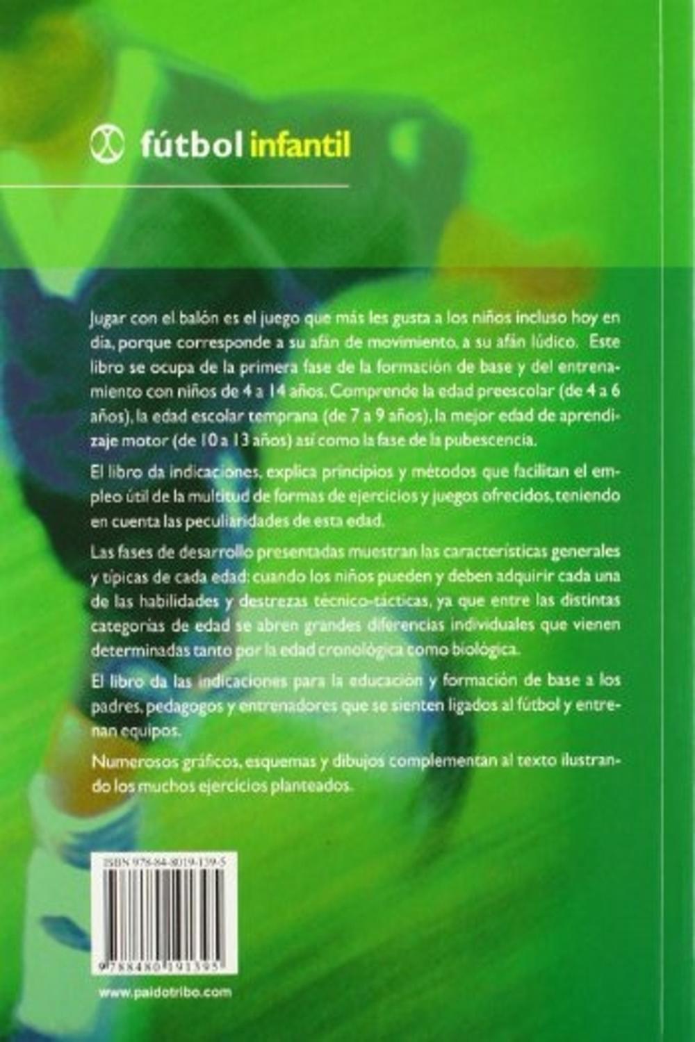 Descripción: Jugar con el balón es el juego que más les gusta a los niños incluso hoy en día, porque corresponde a su afán de movimiento, a su afán lúdico.breste libro se ocupa de la primera base y de la formación de base y del entrenamiento con niños de 4 a 14 años. comprende la edad preescolar (de 4 a 6 años), la edad escolar temprana (de 7 a 9 años), la mejor edad de aprendizaje motor ( de 10 a 13 años) así como la fase de la pubescencia.brel libro da indicaciones, explica principios y métodos que faciliten el empleo útil de la multitud de formas de ejercicios y juegos ofrecidos, teniendo en cuenta las peculiaridades de esta edad.brlas fases de desarrollo presentadas muestran las características generales y típicas de cada edad: cuando los niños pueden y deben adquirir cada una de las habilidades y destrezas técnico tácticas, ya que entre las distintas categorías de edad se abren grandes diferencias individuales que vienen determinadas tanto por la edad cronológica como biológica.brel libro da las indicaciones para la educación y formación de base a los padres, pedagogos y entrenadores que se sienten ligados al fútbol y entrenan equipos.brnumerosos gráficos, esquemas y dibujos complementan al texto ilustrado los muchos ejercicios planteados.