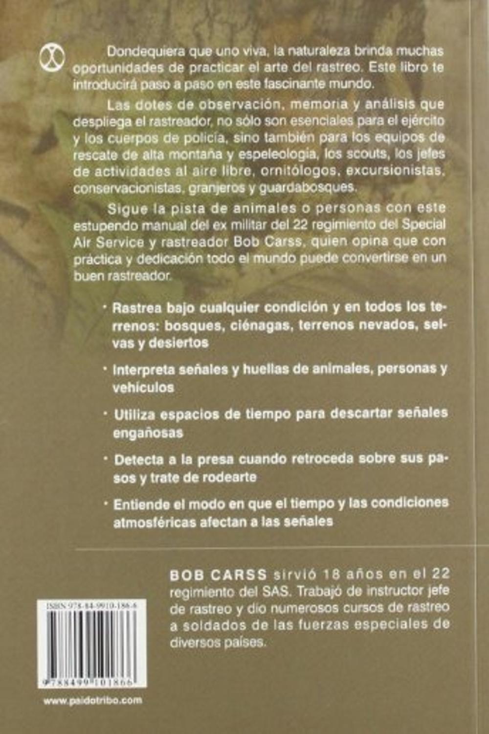 Descripción: Dondequiera que uno viva, la naturaleza brinda muchas oportunidades de practicar el arte del rastreo. este libro te introducirá paso a paso en este fascinante mundo.brlas dotes de observación, memoria y análisis que despliega el rastreador, no sólo son esenciales para el ejército y los cuerpos de policía, sino también para los equipos de rescate de alta montaña y espeleología, los scouts, los jefes de actividades al aire libre, ornitólogos, excursionistas, conservacionistas, granjeros y guardabosques.brsigue la pista de animales o personas con este estupendo manual del ex militar del 22 regimiento del special air service y rastreador bob carss, quién opina que con práctica y dedicación todo el mundo puede convertirse en un buen rastreador.br- rastrea bajo cualquier condición y en todos los terrenos: bosques, ciénagas, terrenos nevados, selvas y desiertos.br- interpreta señales y huellas de animales, personas y vehículos.br- utiliza espacios de tiempo para descartar señales engañosas.br- detecta a la presa cuando retroceda sobre sus pasos y trate de rodearte.br- entiende el modo en que el tiempo y las condiciones atmosféricas afectan a las señales.