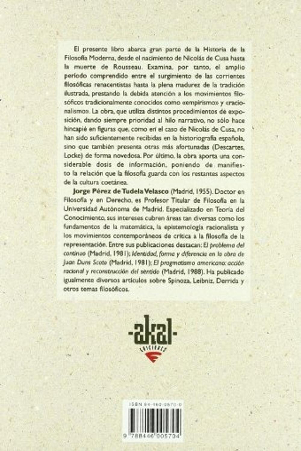 Descripción: El presente libro abarca gran parte de la Historia de la Filosofía Moderna, desde el nacimiento de Nicolás de Cusa hasta la muerte de Rousseau. Examina, por tanto, el amplio período comprendido entre el surgimiento de las corrientes filosóficas renacentistas hasta la plena madurez de la tradición ilustrada, prestando la debida atención a los movimientos filosóficos tradicionalmente conocidos como empirismo y racionalismo. La obra, que utiliza distintos procedimientos de exposición, dando siempre prioridad al hilo narrativo, no sólo hace hincapié en figuras que, como en el caso de Nicolás de Cusa, no han sido suficientemente recibidas en la historiografía española, sino que también presenta otras más afortunadas (Descartes, Locke) de forma novedosa. Por último, la obra aporta una considerable dosis de información, poniendo de manifiesto la relación que la filosofía guarda con los restantes aspectos de la cultura coetánea.