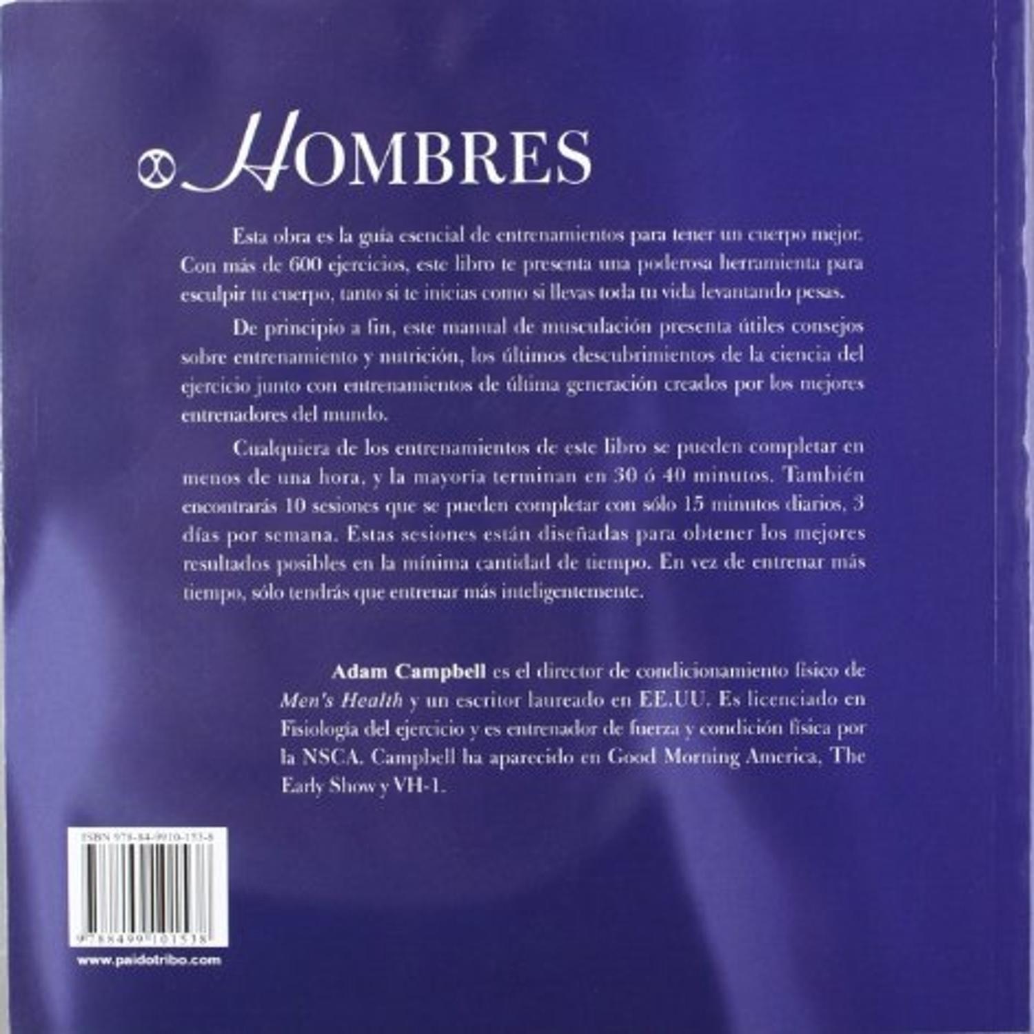 Descripción: Esta obra es la guía esencial de entrenamientos para tener un cuerpo mejor. con más de 600 ejercicios, este libro te presenta una poderosa herramienta para esculpir tu cuerpo, tanto si te inicias como si llevas toda tu vida levantando pesas.brde principio a fin, este manual de musculación presenta útiles consejos sobre entrenamiento y nutrición, los últimos descubrimientos de la ciencia del ejercicio junto con entrenamientos de última generación creados por los mejores entrenadores del mundo.brcualquiera de los entrenamientos de este libro se pueden completar en menos de una hora, y la mayoría terminan en 30 ó 40 minutos. también encontrarás 10 sesiones que se pueden completar con sólo 15 minutos diarios, 3 días por semana. estas sesiones están diseñadas para obtener los mejores resultados posibles en la mínima cantidad de tiempo. en vez de entrenar más tiempo, sólo tendrás que entrenar más inteligentemente.bradam campbell es el director de condicionamiento físico de men’s health y un escritor laureado en ee.uu. es licenciado en fisiología del ejercicio y es entrenador de fuerza y condición física por la nsca. campbell ha aparecido en good morning american, the early show y vh-1.