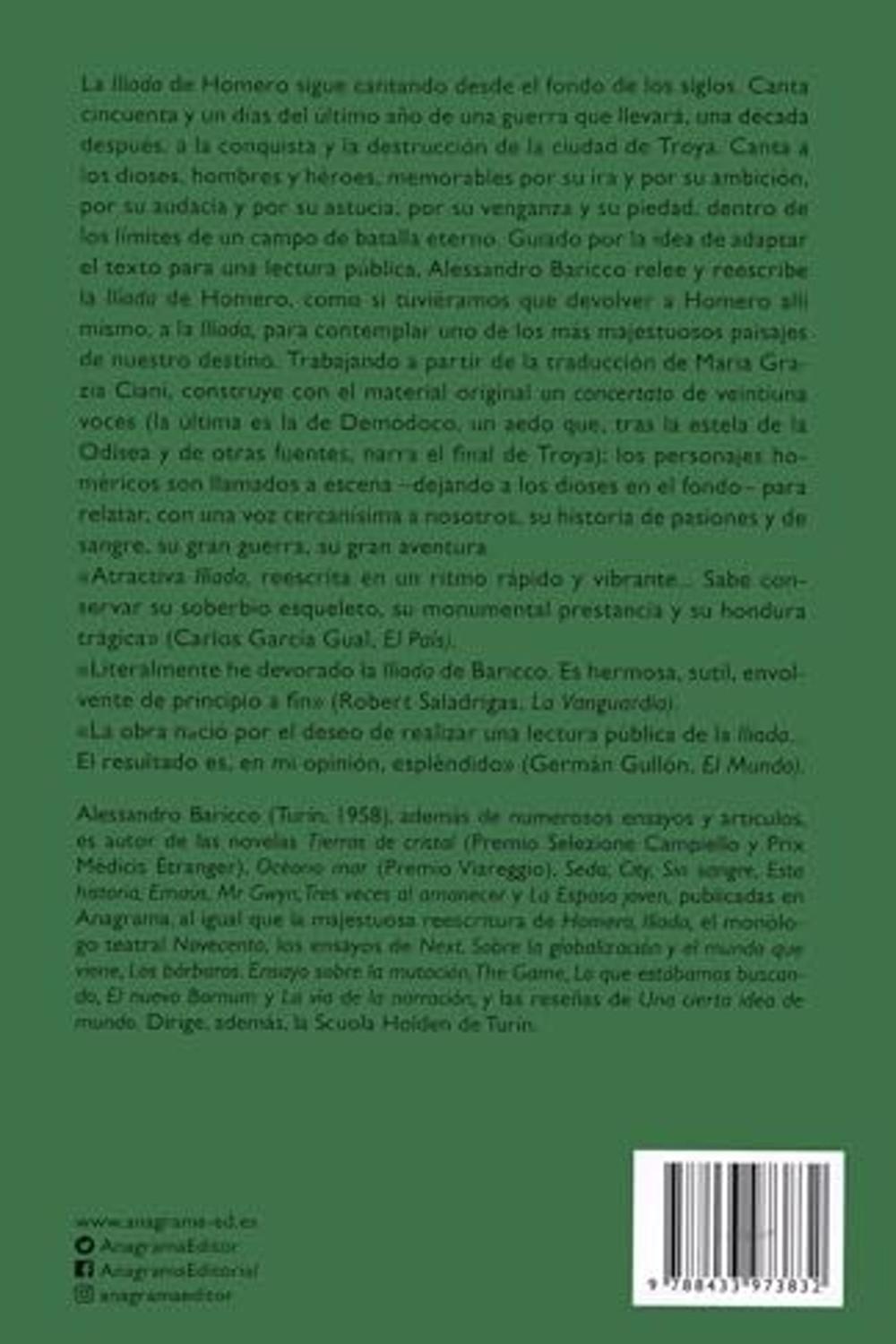 Descripción: La Ilíada de Homero sigue cantando desde el fondo de los siglos. Canta cincuenta y un días del último año de una guerra que llevará, una década después, a la conquista y la destrucción de la ciudad de Troya. Canta a los dioses, hombres y héroes. Guiado por la idea de adaptar el texto para una lectura pública, Alessandro Baricco relee y rescribe la Ilíada de Homero, construyendo con el material original un concertato de veintiuna voces; los personajes homéricos son llamados a escena para relatar, con una voz cercanísima a nosotros, su historia de pasiones y de sangre, su gran guerra, su gran aventura. «Atractiva Ilíada, reescrita en un ritmo rápido y vibrante... Sabe conservar su soberbio esqueleto, su monumental prestancia y su hondura trágica» (Carlos García Gual, El País); «Literalmente he devorado la Ilíada de Baricco. Es hermosa, sutil, envolvente de principio a fin» (Robert Saladrigas, La Vanguardia).