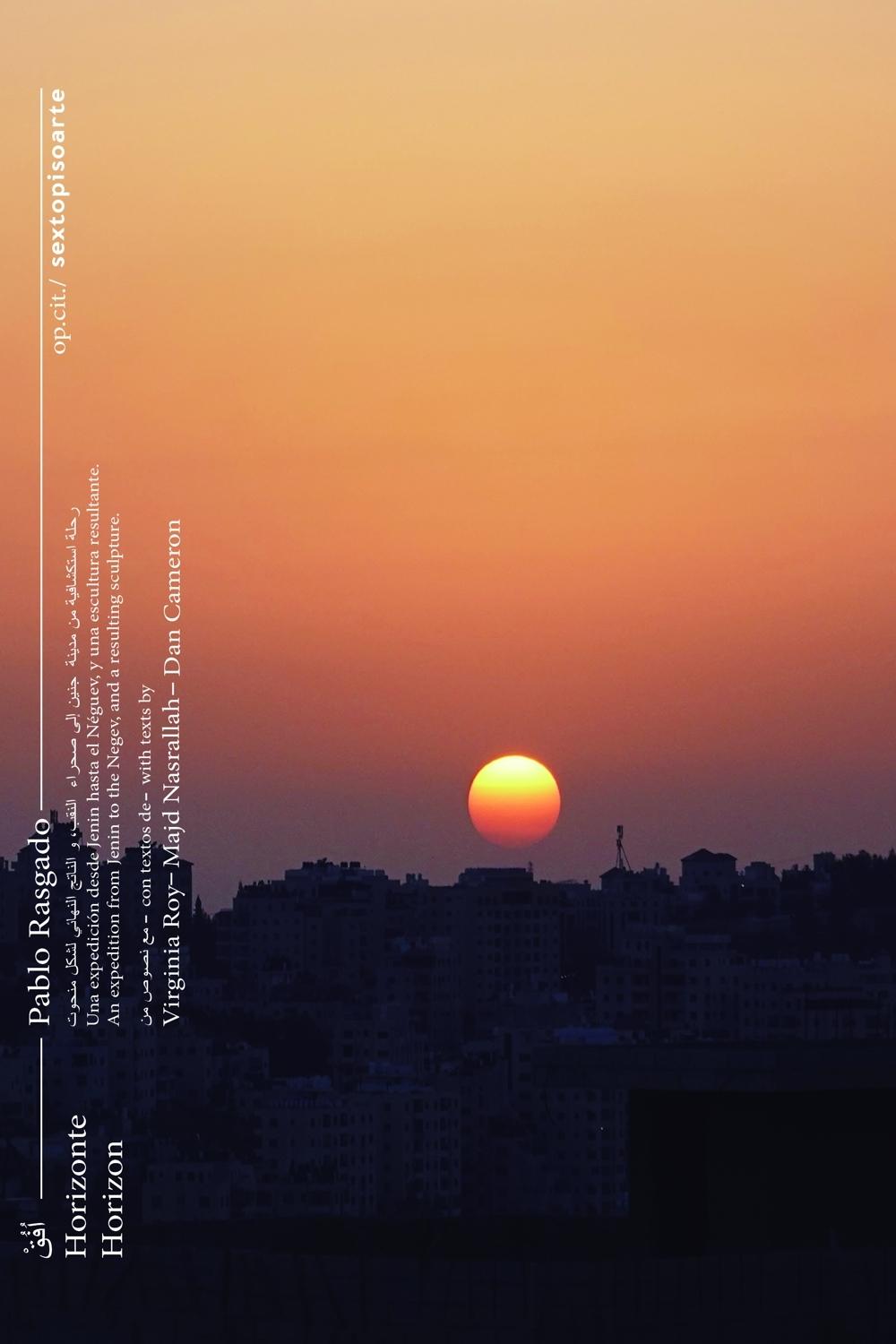Descripción: Horizonte es un proyecto editorial del artista Pablo Rasgado que surge de varios años de investigación en el territorio palestino, donde indaga en las huellas de la ocupación ins critas en el paisaje desde una perspectiva tafonómica: enfocada al despojo, la descomposición y el residuo. Entre 2019 y 2023, el artista realizó recorridos de investigación en ciuda des como Ramallah, Belén, Hebrón, Jenin y Nablús, reco lectando materiales geológicos, arquitectónicos y humanos, que dieron lugar a una serie de obras para sitio específico, llevadas a cabo en colaboración con especialistas e insti tuciones como la A. M. Qattan Foundation y RIWAQ. El libro, concebido en formato trilingüe (árabe, español e inglés), cuenta con 176 páginas, más de cien imágenes inéditas y textos de Virginia Roy, Majd Nasrallah, Dan Cameron y el propio artista.