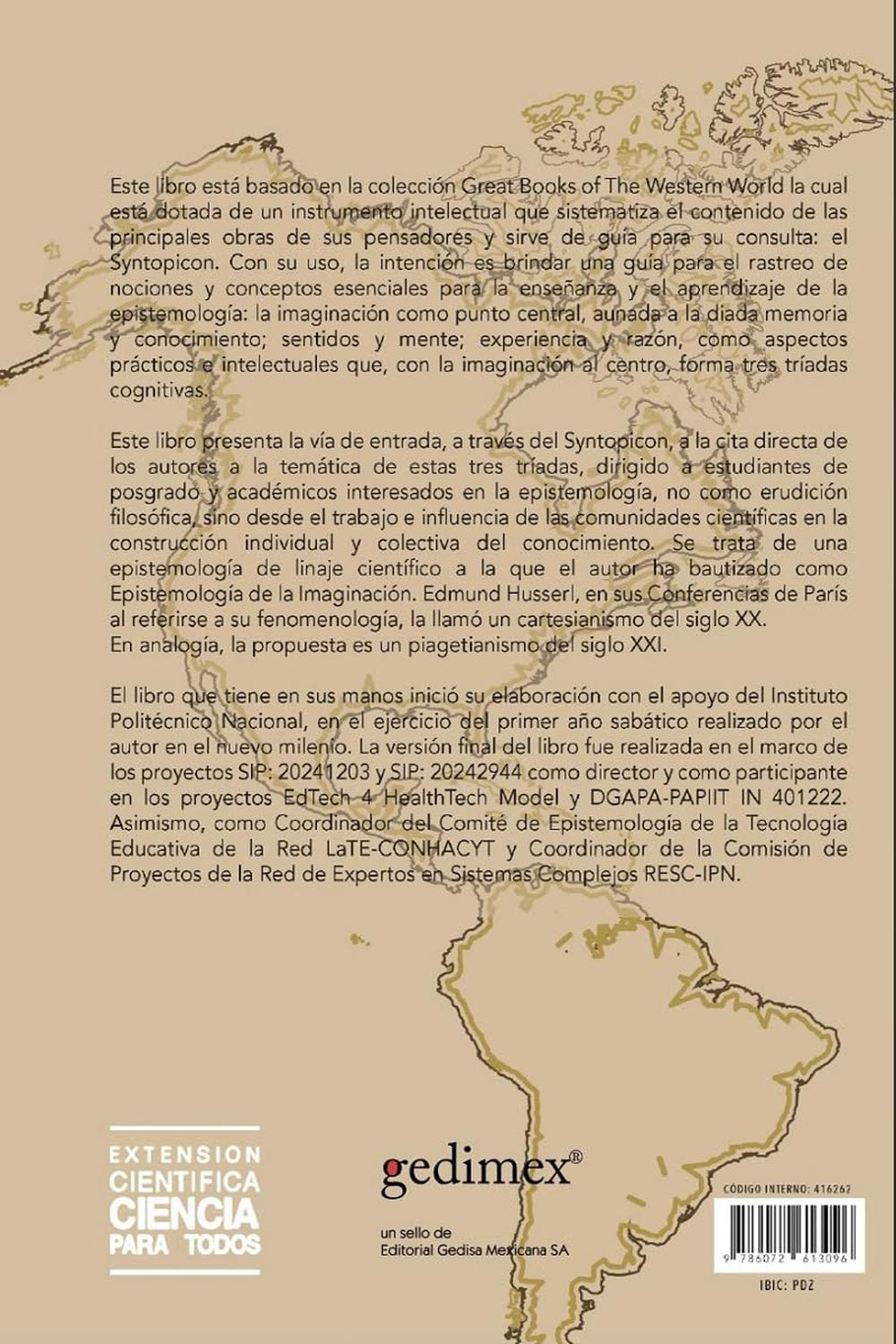 Descripción: Este libro está basado en la colección Great Books of The Western World la cual está dotada de un instrumento intelectual que sistematiza el contenido de las principales obras de sus pensadores y sirve de guía para su consulta: el Syntopicon. Con su uso la intención es brindar una guía para el rastreo de nociones y conceptos esenciales para la enseñanza y el aprendizaje de la epistemología: la imaginación como punto central, aunada a la diada memoria y conocimiento; sentidos y mente; experiencia y razón, como aspectos prácticos e intelectuales que, con la imaginación al centro forma tres tríadas cognitivas.
