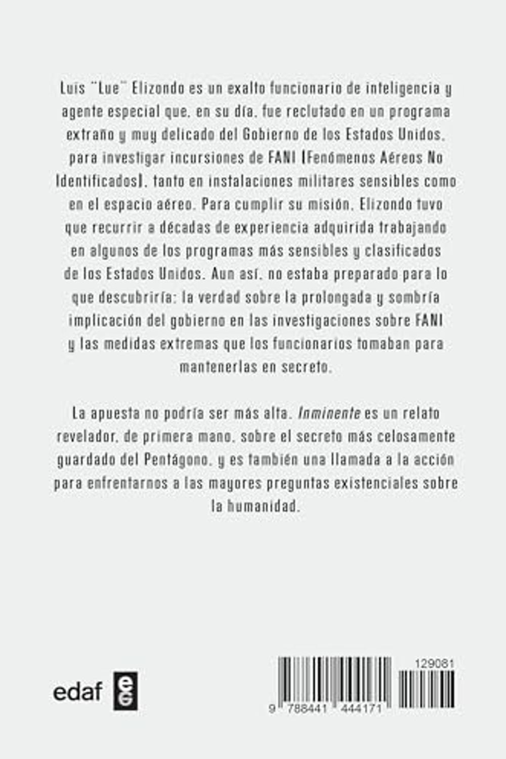 Descripción: Luis “Lue” Elizondo, exfuncionario de inteligencia y agente especial, fue reclutado por el Gobierno de EE. UU. para investigar fenómenos aéreos no identificados (FANI) en instalaciones militares y el espacio aéreo. A través de su experiencia en programas clasificados, Elizondo descubrió la profunda y oculta implicación del gobierno en estas investigaciones, así como las extremas medidas tomadas para mantenerlas en secreto. Inminente es un relato revelador sobre el secreto mejor guardado del Pentágono, y una reflexión sobre las grandes preguntas existenciales de la humanidad.