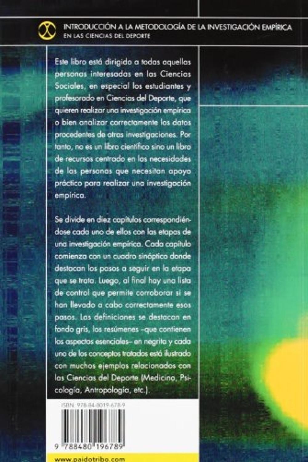 Descripción: Este libro está dirigido a todas aquellas personas interesadas en las ciencias sociales, en especial los estudiantes y profesorado en ciencias del deporte, que quieren realizar una investigación empírica o bien analizar correctamente los datos procedentes de otras investigaciones. por tanto, no es un libro científico sino un libro de recursos centrado en las necesidades de las personas que necesitan apoyo práctico para realizar una investigación empírica.brse divide en diez capítulos correspondiéndose cada uno de ellos con las etapas de una investigación empírica. cada capítulo comienza con un cuadro sinóptico donde destacan los pasos a seguir en la etapa que se trata. luego, al final hay una lista de control que permite corroborar si se han llevado a cabo correctamente esos pasos. las definiciones se destacan en fondo gris, los resúmenes –que contienen los aspectos esenciales- en negrita y cada uno de los conceptos tratados está ilustrado con muchos ejemplos relacionados con las ciencias del deporte (medicina, psicología, antropología, etc.)