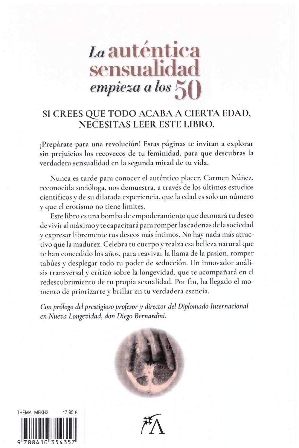 Descripción: Si crees que todo acaba a cierta edad, necesitas leer este libro. ¡Prepárate para una revolución! Estas páginas te invitan a explorar, sin prejuicios, los recovecos de tu feminidad, para que descubras la verdadera sensualidad en la segunda mitad de tu vida. Nunca es tarde para conocer el auténtico placer. Carmen Núñez, reconocida socióloga, nos demuestra —a través de los últimos estudios científicos y de su dilatada experiencia— que la edad es solo un número y que el erotismo no tiene límites. Este libro es una bomba de empoderamiento que detonará tu deseo de vivir al máximo y te capacitará para romper las cadenas de la sociedad, y expresar libremente tus deseos más íntimos. No hay nada más atractivo que la madurez. Celebra tu cuerpo y realza esa belleza natural que te han concedido los años, para reavivar la llama de la pasión, romper tabúes y desplegar todo tu poder de seducción. Un innovador análisis transversal y crítico sobre la longevidad, que te acompañará en el redescubrimiento de tu propia sexualidad. Por fin, ha llegado el momento de priorizarte y brillar en tu verdadera esencia. Con prólogo del prestigioso profesor y director Diplomado en Nueva Longevidad, Diego Bernardini.
