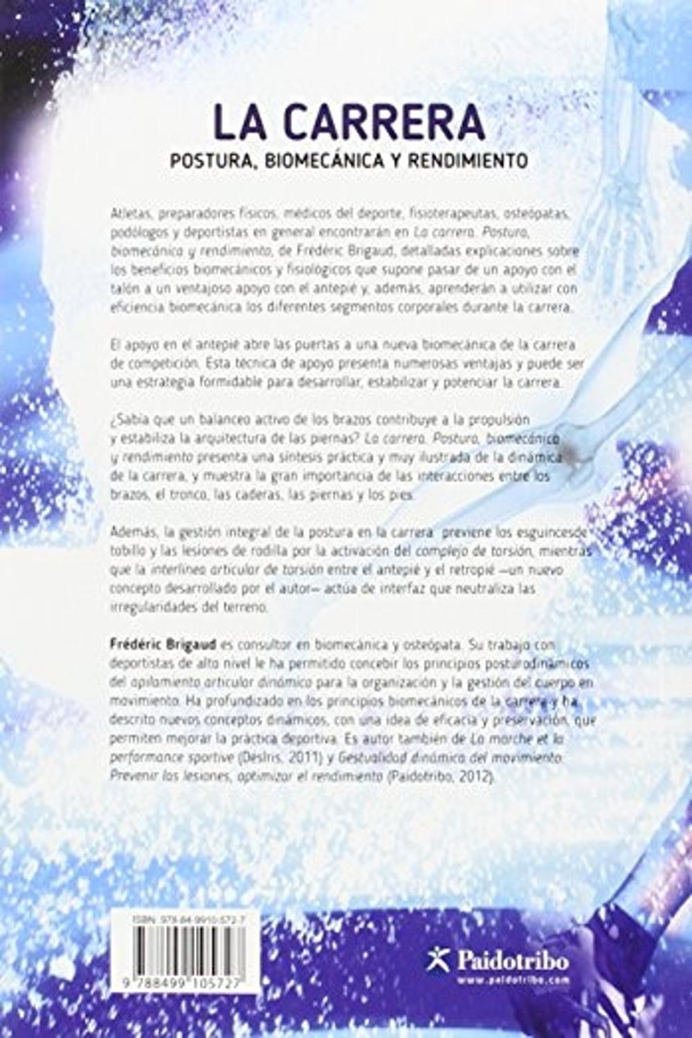 Descripción: Atletas, preparadores físicos, médicos del deporte, fisioterapeutas, osteópatas, podólogos y deportistas en general encontrarán en la carrera. postura, biomecánica y rendimiento, de frédéric brigaud, detalladas explicaciones sobre los beneficios biomecánicos y fisiológicos que supone pasar de un apoyo con el talón a un ventajoso apoyo con el antepié y, además, aprenderán a utilizar con eficiencia biomecánica los diferentes segmentos corporales durante la carrera. br el apoyo en el antepié abre las puertas a una nueva biomecánica de la carrera de competición. esta técnica de apoyo presenta numerosas ventajas y puede ser una estrategia formidable para desarrollar, estabilizar y potenciar la carrera. br ¿sabía que un balanceo activo de los brazos contribuye a la propulsión y estabiliza la arquitectura de las piernas? la carrera. postura, biomecánica y rendimiento presenta una síntesis práctica y muy ilustrada de la dinámica de la carrera, y muestra la gran importancia de las interacciones entre los brazos, el tronco, las caderas, las piernas y los pies. br además, la gestión integral de la postura en la carrera previene los esguinces de tobillo y las lesiones de rodilla por la activación del complejo de torsión, mientras que la interlínea articular de torsión entre el antepié y el retropié —un nuevo concepto desarrollado por el autor— actúa de interfaz que neutraliza las irregularidades del terreno.