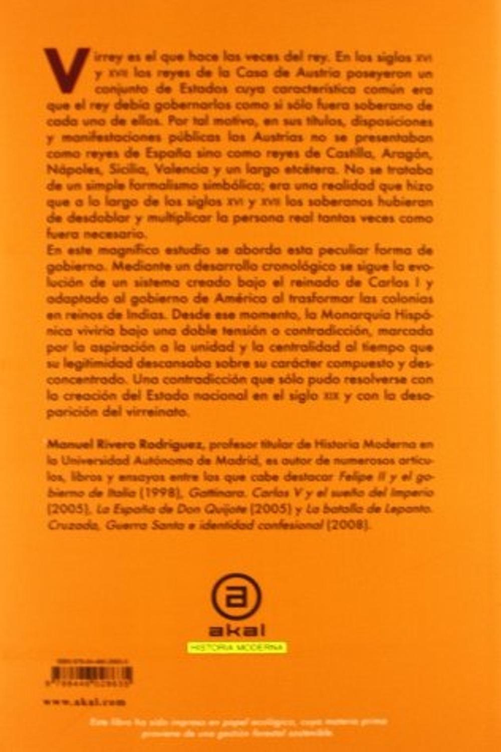Descripción: Virrey es el que hace las veces del rey. En los siglos XVI y XVII los reyes de la Casa de Austria poseyeron un conjunto de Estados cuya característica común era que el rey debía gobernarlos como si sólo fuera soberano de cada uno de ellos. Por tal motivo, en sus títulos, disposiciones y manifestaciones públicas los Austrias no se presentaban como reyes de España sino como reyes de Castilla, Aragón, Nápoles, Sicilia, Valencia y un largo etcétera. No se trataba de un simple formalismo simbólico. era una realidad que hizo que a lo largo de los siglos XVI y XVII los soberanos hubieran de desdoblar y multiplicar la persona real tantas veces como fuera necesario. En este magnífico estudio se aborda esta peculiar forma de gobierno. Mediante un desarrollo cronológico se sigue la evolución de un sistema creado bajo el reinado de Carlos I y adaptado al gobierno de América al trasformar las colonias en reinos de Indias. Desde ese momento, la Monarquía Hispánica viviría bajo una doble tensión o contradicción, marcada por la aspiración a la unidad y la centralidad al tiempo que su legitimidad descansaba sobre su carácter compuesto y desconcentrado. Una contradicción que sólo pudo resolverse con la creación del Estado nacional en el siglo XIX y con la desaparición del virreinato.
