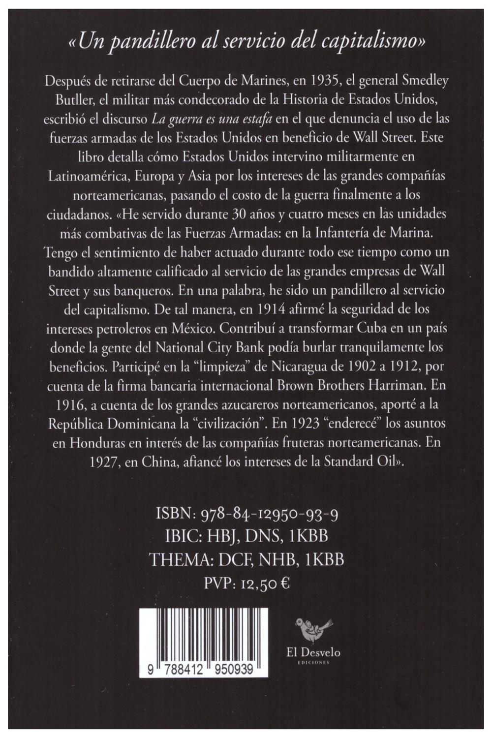 Descripción: ¿Qué impulsó al militar más condecorado de Estados Unidos a publicar el más feroz alegato contra la guerra? Tal vez nunca se sepa con certeza, aunque Smedley Butler sí sabía de lo que hablaba al lanzar su acusación contundente contra los intereses económicos que llevaron a generaciones enteras al matadero. Butler participó en múltiples operaciones militares de expansión colonial y comercial de Estados Unidos, antes de que este país se convirtiera, tras la Segunda Guerra Mundial, en la superpotencia hegemónica. Allí donde se necesitará intervenir militarmente (México, Honduras, Nicaragua, China…), el gobierno estadounidense recurría al cuerpo que más veces actuó en conflictos bélicos en el siglo XX: el de los Marines, y a su más destacado y fiel servidor, Smedley Butler. Pero fue la barbarie industrializada de la Primera Guerra Mundial —con su factura de millones de muertos— y el inminente corolario de una Segunda Guerra Mundial lo que llevó, en 1935, a Butler a estallar y publicar La guerra es una estafa (War Is a Racket), un texto que va mucho más allá de un panfleto: es el relato documentado de cómo los jóvenes son masacrados por intereses económicos inconfesables de sus propios gobiernos, es decir, de sus mayores. “Tengo el sentimiento de haber actuado durante todo ese tiempo como un bandido altamente calificado al servicio de las grandes empresas de Wall Street y sus banqueros. En una palabra, he sido un pandillero al servicio del capitalismo. De tal manera, en 1914 afirmé la seguridad de los intereses petroleros en México. Contribuí a transformar Cuba en un país donde la gente del National City Bank podía burlar tranquilamente los beneficios. Participé en la ‘limpieza’ de Nicaragua de 1902 a 1912, por cuenta de la firma bancaria internacional Brown Brothers Harriman. En 1916, por cuenta de los grandes azucareros norteamericanos, aporté a la República Dominicana la ‘civilización’. En 1923, “enderecé” los asuntos en Honduras en interés de las compañías fruteras norteamericanas. En 1927, en China, afiancé los intereses de la Standard Oil”.