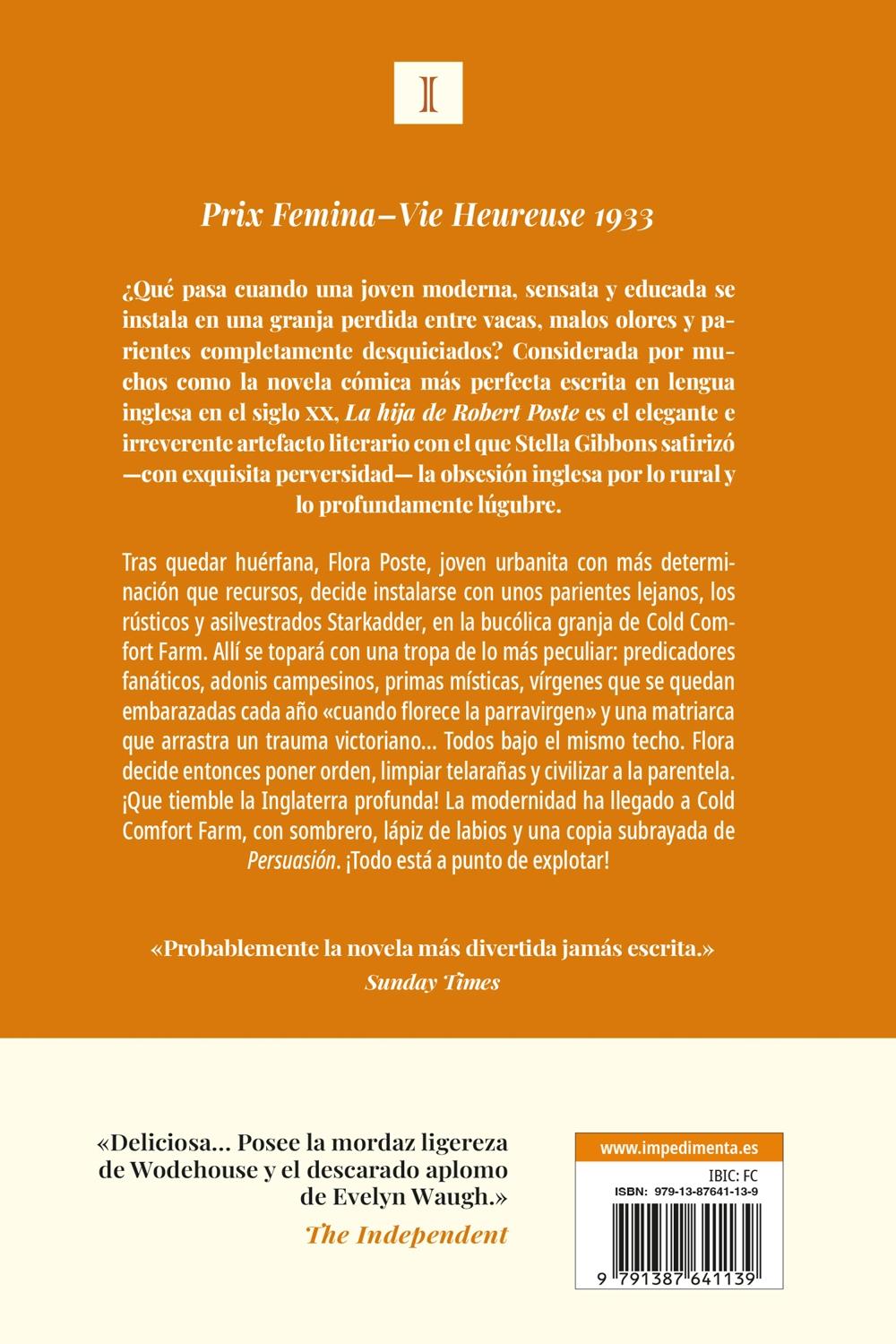 Descripción: ¿Qué pasa cuando una joven moderna, sensata y educada se instala en una granja perdida entre vacas, malos olores y parientes completamente desquiciados? Considerada por muchos como la novela cómica más perfecta escrita en lengua inglesa en el siglo XX, La hija de Robert Poste es el elegante e irreverente artefacto literario con el que Stella Gibbons satirizó con exquisita perversidad la obsesión inglesa por lo rural y lo profundamente lúgubre. Tras quedar huérfana, Flora Poste, joven urbanita con más determinación que recursos, decide instalarse con unos parientes lejanos, los rústicos y asilvestrados Starkadder, en la bucólica granja de Cold Comfort Farm. Allí se topará con una tropa de lo más peculiar: predicadores fanáticos, adonis campesinos, primas místicas, vírgenes que se quedan embarazadas cada año "cuando florece la parravirgen" y una matriarca que arrastra un trauma victoriano. . . Todos bajo el mismo techo.