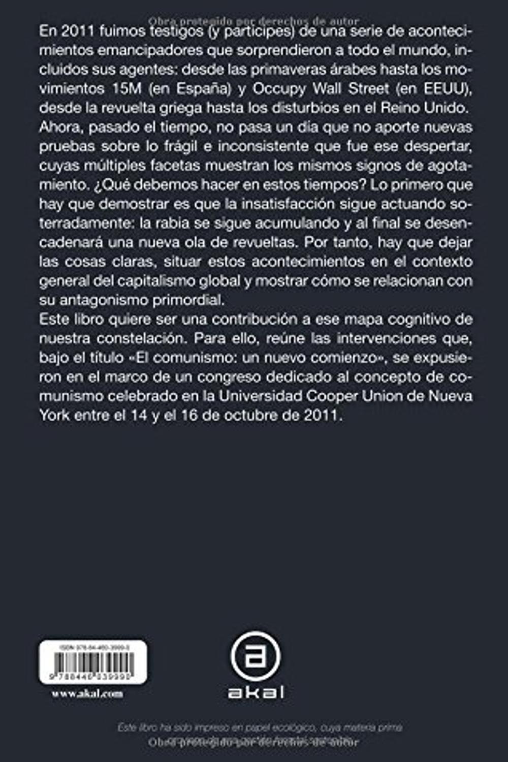 Descripción: En 2011 fuimos testigos (y partícipes) de una serie de acontecimientos emancipadores que sorprendieron a todo el mundo, incluidos sus agentes: desde las primaveras árabes hasta los movimientos 15M (en España) y Occupy Wall Street (en EEUU), desde la revuelta griega hasta los disturbios en el Reino Unido. Ahora, pasado el tiempo, no pasa un día que no aporte nuevas pruebas sobre lo frágil e inconsistente que fue ese despertar, cuyas múltiples facetas muestran los mismos signos de agotamiento. ¿Qué debemos hacer en estos tiempos? Lo primero que hay que demostrar es que la insatisfacción sigue actuando soterradamente: la rabia se sigue acumulando y al final se desencadenará una nueva ola de revueltas. Por tanto, hay que dejar las cosas claras, situar estos acontecimientos en el contexto general del capitalismo global y mostrar cómo se relacionan con su antagonismo primordial. Este libro quiere ser una contribución a ese mapa cognitivo de nuestra constelación. Para ello, reúne las intervenciones que, bajo el título «El comunismo: un nuevo comienzo», se expusieron en el marco de un congreso dedicado al concepto de comunismo celebrado en la Universidad Cooper Union de Nueva York entre el 14 y el 16 de octubre de 2011.