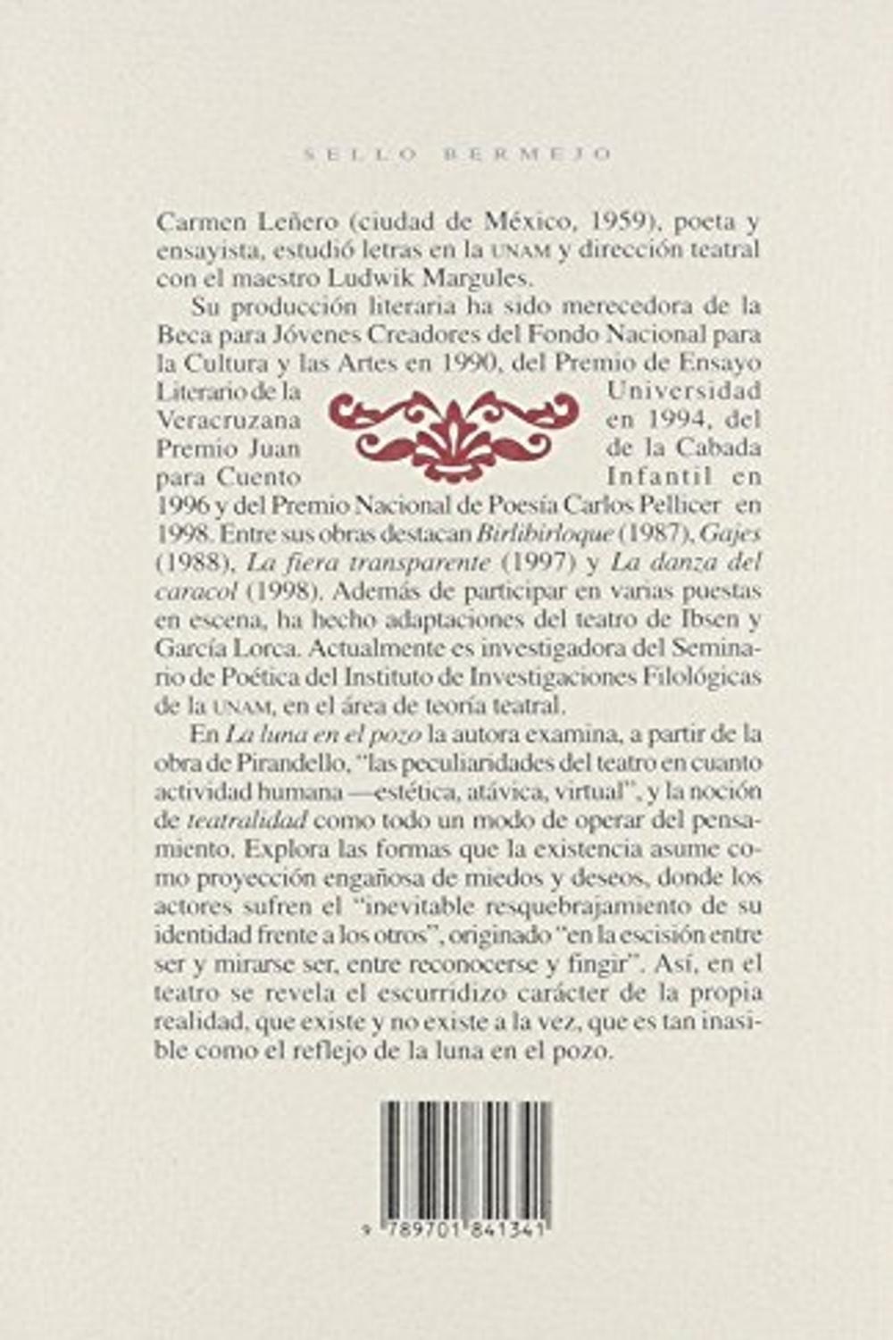 Descripción: Carmen Leñero (ciudad de México, 1959), poeta y ensayista, estudió letras en la UNAM y dirección teatral con el maestro Ludwik Margules. Su producción literaria ha sido merecedora de la Beca para Jóvenes Creadores del Fondo Nacional para la Cultura y las Artes en 1990, del Premio de Ensayo Literario de la Universidad Veracruzana en 1994, del Premio Juan de la Cabada para Cuento Infantil en 1996 y del Premio Nacional de Poesía Carlos Pellicer en 1998. Entre sus obras destacan “Birlibirloque” (1987), “Gajes” (1988), “La fiera transparente” (1997) y “La danza del caracol” (1998). Además de participar en varias puestas en escena, ha hecho adaptaciones del teatro de Ibsen y García Lorca. Actualmente es investigadora del Seminario de Poética del Instituto de Investigaciones Filológicas de la UNAM, en el área de teoría teatral. En “La luna en el pozo” la autora examina, a partir de la obra de Pirandello, “las peculiaridades del teatro en cuanto actividad humana” –estética, atávica, virtual”, y la noción de teatralidad como todo un modo de operar del pensamiento. Explora las formas que la existencia asume como proyección engañosa de miedos y deseos, donde los actores sufren el “inevitable resquebrajamiento de su identidad frente a los otros”, originado “en la escisión entre ser y mirarse ser, entre reconocerse y fingir”. Así, en el teatro se revela el escurridizo carácter de la propia realidad, que existe y no existe a la vez, que es tan inasible como el reflejo de la luna en el pozo.