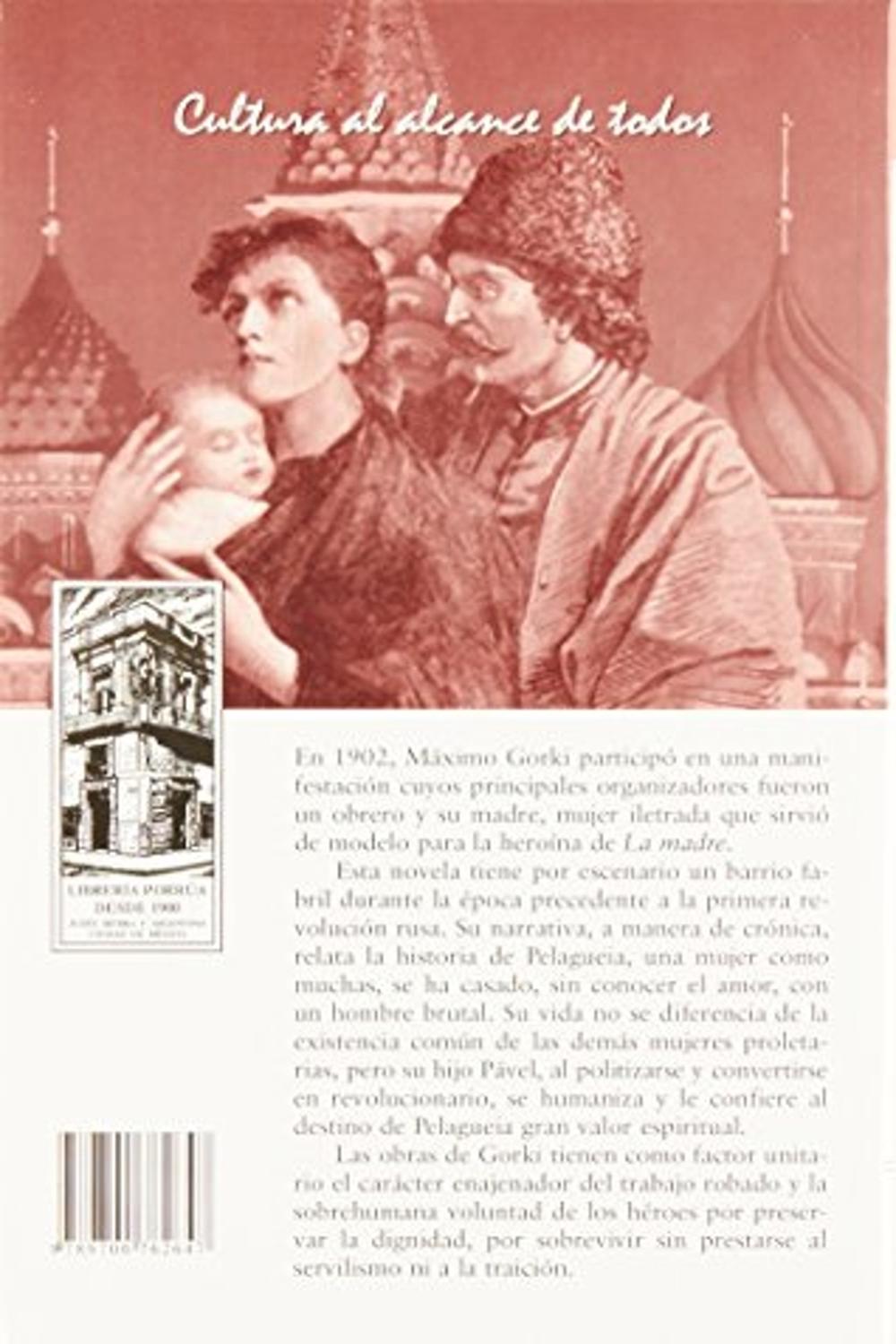 Descripción: En 1902, Máximo Gorki participó en una manifestación cuyos principales organizadores fueron un obrero y su madre, mujer iletrada que sirvió de modelo para la heroína de La madre. Esta novela tiene por escenario un barrio fabril durante la época precedente a la primera revolución rusa. Su narrativa, a manera de crónica, relata la historia de Pelagueia, una mujer como muchas, se ha casado, sin conocer el amor, con un hombre brutal. Su vida no se diferencia de la existencia común de las demás mujeres proletarias, pero su hijo Pável, al politizarse y convertirse en revolucionario, se humaniza y le confiere al destino de Pelagueia gran valor espiritual. Las obras de Gorki tienen como factor unitario el carácter enajenador del trabajo robado y la sobrehumana voluntad de los héroes por preservar la dignidad, por sobrevivir sin prestarse al servilismo ni a la traición.