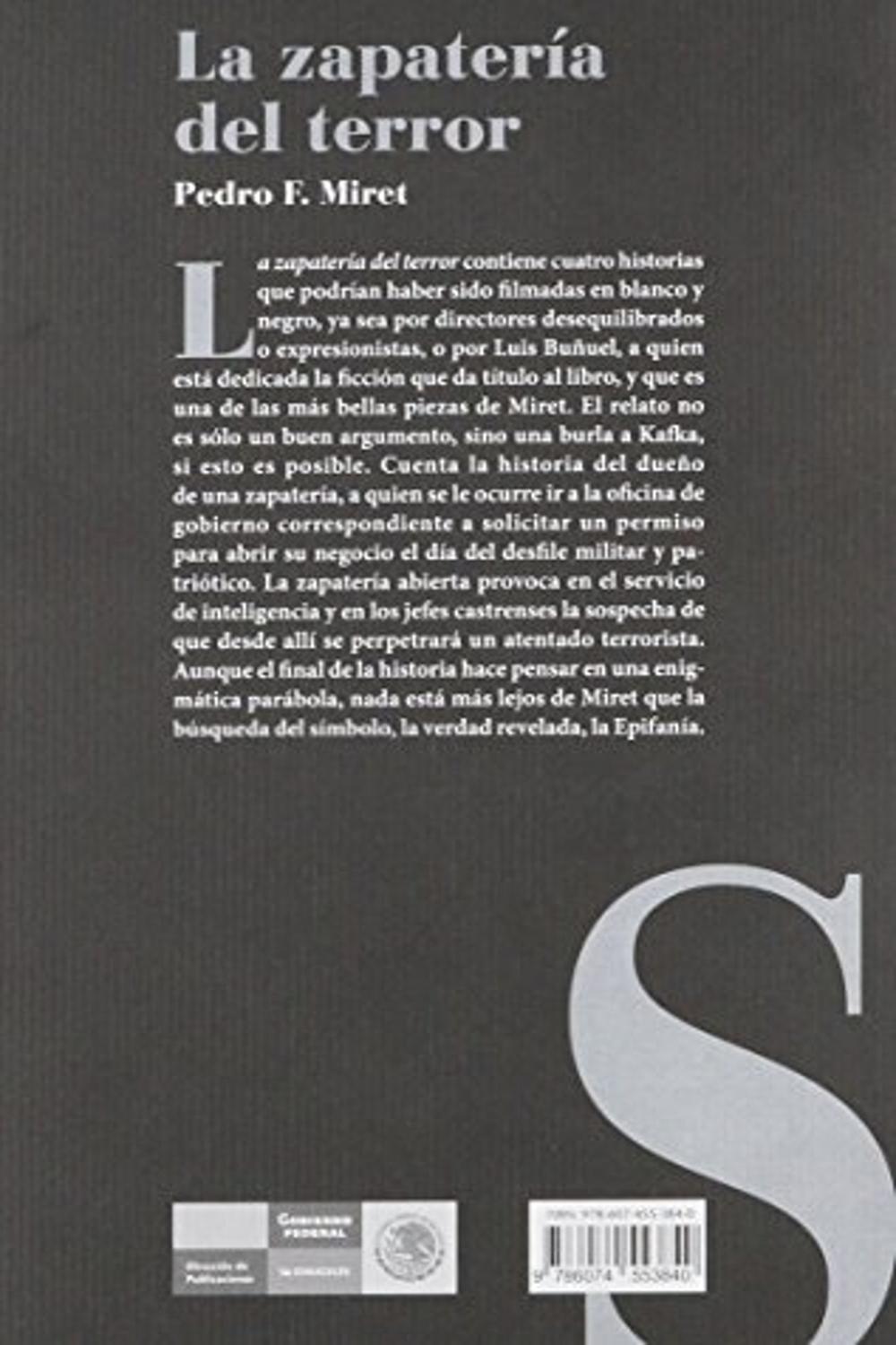 Descripción: La zapatería del terror contiene cuatro historias que podrían haber sido filmadas en blanco y negro, ya sea por directores desequilibrados o expresionistas, o por Luis Buñuel, a quien está dedicada la ficción que da título al libro, y que es una de las más bellas piezas de Miret. El relato no es sólo un buen argumento, sino una burla a Kafka, si esto es posible. Cuenta la historia del dueño de una zapatería, a quien se le ocurre ir a la oficina de gobierno correspondiente a solicitar un permiso para abrir su negocio el día del desfile militar y patriótico. La zapatería abierta provoca en el servicio de inteligencia y en los jefes castrenses la sospecha de que desde allí se perpetrará un atentado terrorista. Aunque el final de la historia hace pensar en una enigmática parábola, nada está más lejos de Miret que la búsqueda del símbolo, la verdad revelada, la Epifanía.