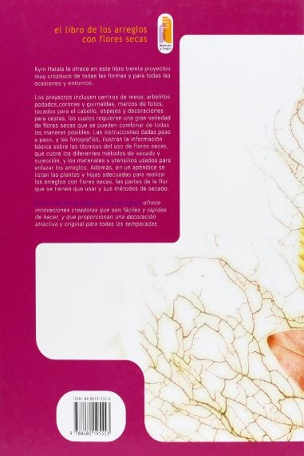 Descripción: Kym hatala le ofrece en este libro treinta proyectos muy creativos de todas las formas y para todas las ocasiones y entornos.brlos proyectos incluyen centros de mesa, arbolitos podados, coronas y guirnaldas, marcos de fotos, tocados para el cabello, espejos y decoraciones para cestas, los cuales requieren una gran variedad de flores secas que se pueden combinar de todas las maneras posibles. las instrucciones dadas paso a paso, y las fotografías, ilustran la información básica sobre las técnicas del uso de flores secas, que cubre los diferentes métodos de secado y sujeción, y los materiales y utensilios usados para enlazar los arreglos. además, en un apéndice se listan las plantas y hojas adecuadas para realizar los arreglos con flores secas, las partes de la flor que se tienen que usar y sus métodos de secado.brel libro de los arreglos con flores secas ofrece innovaciones creadoras que son fáciles y rápidas de hacer, y que proporcionan una decoración atractiva y original para todas las temporadas.