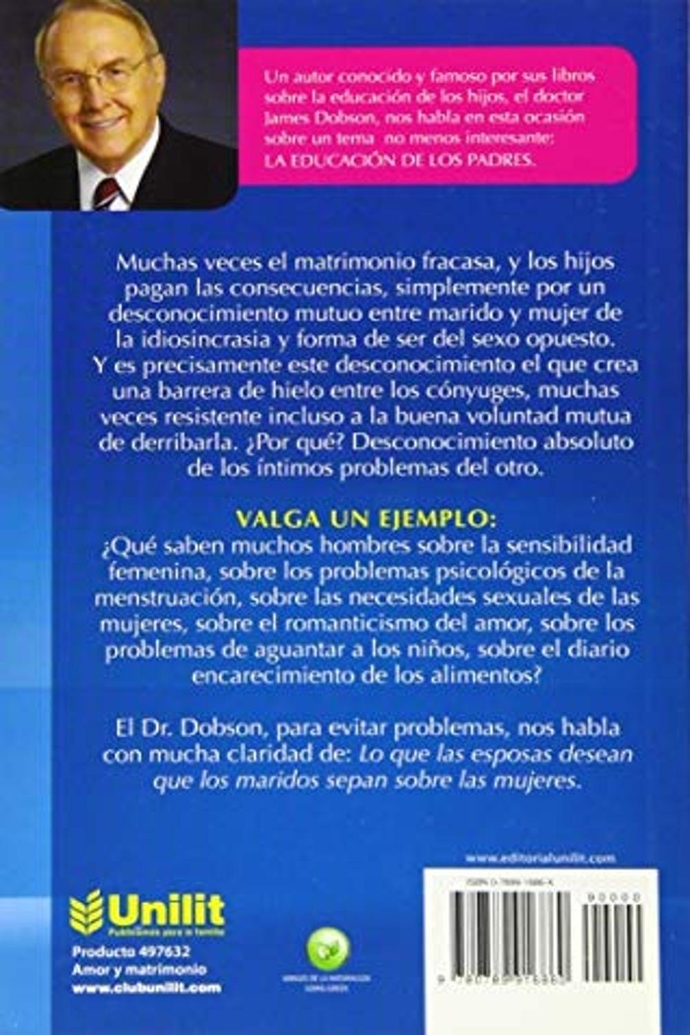 Descripción: El Dr. James Dobson proporciona una mirada empática a las barreras que impiden la armonía matrimonial, ofreciendo sugerencias perspicaces y útiles sobre temas como la baja autoestima, la depresión, la soledad y el aburrimiento en el matrimonio, los problemas sexuales, las dificultades financieras, los problemas hormonales y fisiológicos y otros. Tanto los hombres como las mujeres encontrarán su discusión interesante, a menudo humorística e inmensamente práctica para la vida diaria.