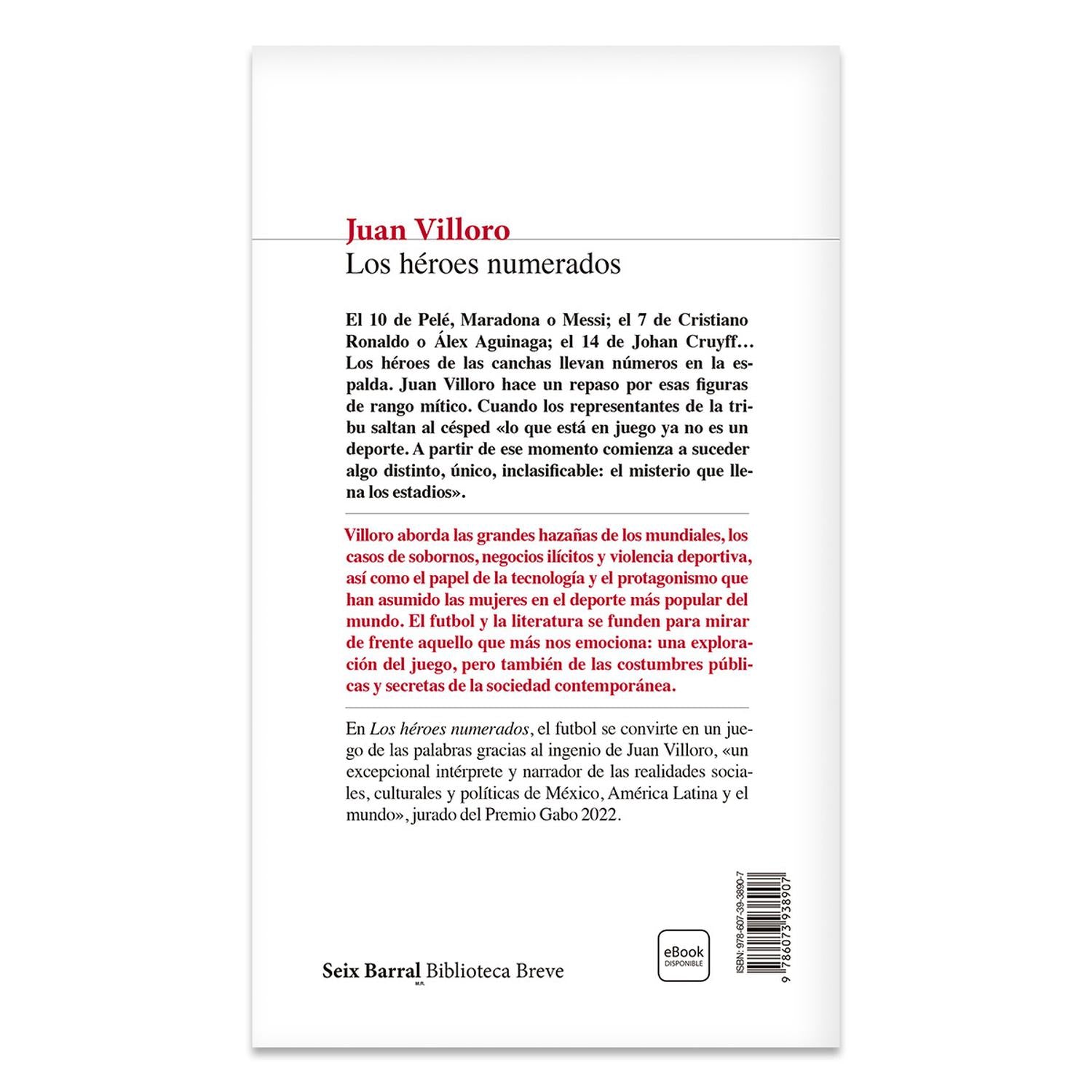 Descripción: En Los héroes numerados, el futbol se convirte en un juego de las palabras gracias al ingenio de Juan Villoro, «un excepcional intérprete y narrador de las realidades sociales, culturales y políticas de México, América Latina y el mundo», jurado del Premio Gabo 2022.El 10 de Pelé, Maradona o Messi; el 7 de Cristiano Ronaldo o Álex Aguinaga; el 14 de Johan Cruyff… Los héroes de las canchas llevan números en la espalda. Juan Villoro hace un repaso por esas figuras de rango mítico. Cuando los representantes de la tribu saltan al césped «lo que está en juego ya no es un deporte. A partir de ese momento comienza a suceder algo distinto, único, inclasificable: el misterio que llena los estadios». Villoro aborda las grandes hazañas de los mundiales, los casos de sobornos, negocios ilícitos y violencia deportiva, así como el papel de la tecnología y el protagonismo que han asumido las mujeres en el deporte más popular del mundo. El futbol y la literatura se funden para mirar de frente aquello que más nos emociona: una exploración del juego, pero también de las costumbres públicas y secretas de la sociedad contemporánea.