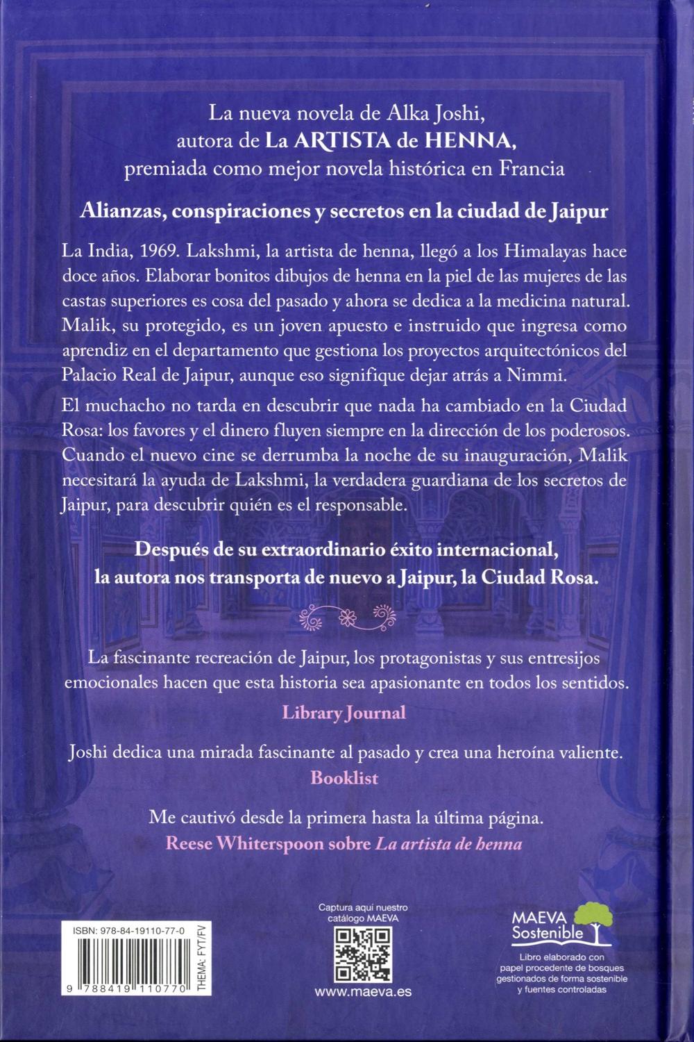 Descripción: Alianzas, conspiraciones y secretos en la ciudad de Jaipur. Después de su extraordinario éxito internacional, la autora nos transporta a la enigmática Ciudad Púrpura. India, 1969. Han pasado doce años desde que Lakshmi, la artista de henna, llegó a los Himalayas. Jaipur es cosa del pasado y ahora se dedica a la medicina natural. Malik, su protegido, es un joven apuesto e instruido que ingresa en la Oficina de Instalaciones del Palacio Real de Jaipur, aunque eso signifique dejar atrás a Nimmi, una joven pastora. El muchacho no tarda en descubrir que nada ha cambiado en la Ciudad Púrpura: los favores y el dinero fluyen siempre en la dirección de los poderosos. Cuando el nuevo cine se derrumba la noche de su inauguración, Malik necesitará la ayuda de Lakshmi, la verdadera guardiana de los secretos de Jaipur, para descubrir quién es el responsable.