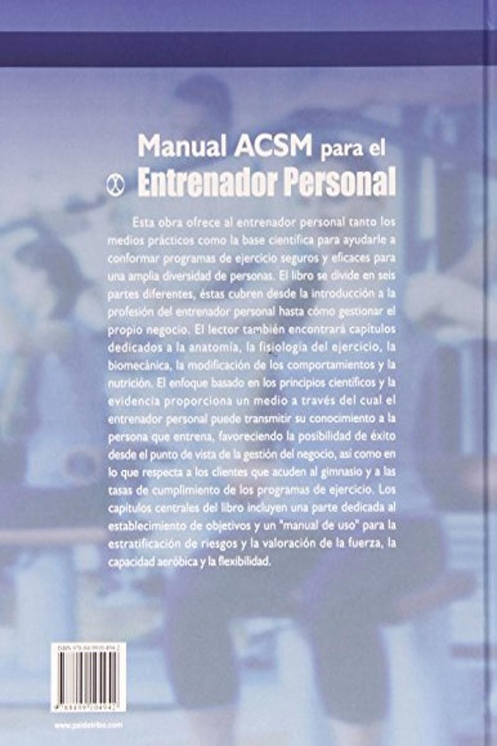 Descripción: Esta obra ofrece al entrenador personal tanto los medios prácticos como la base científica para ayudarle a conformar programas de ejercicio seguros y eficaces para una amplia diversidad de personas.br el libro se divide en seis partes diferentes, éstas cubren desde la introducción a la profesión del entrenador personal hasta cómo gestionar el propio negocio. el lector también encontrará capítulos dedicados a la anatomía, la fisiología del ejercicio, la biomecánica, la modificación de los comportamientos y la nutrición. el enfoque basado en los principios científicos y la evidencia proporciona un medio a través del cual el entrenador personal puede transmitir su conocimiento a la persona que entrena, favoreciendo la posibilidad de éxito desde el punto de vista de la gestión del negocio, así como en lo que respecta a los clientes que acuden al gimnasio y a las tasas de cumplimiento de los programas de ejercicio. los capítulos centrales del libro incluyen una parte dedicada al establecimiento de objetivos y un manual de uso para la estratificación de riesgos y la valoración de la fuerza, la capacidad aeróbica y la flexibilidad.