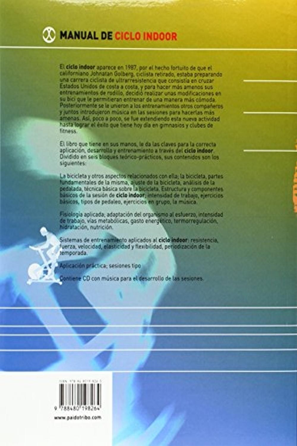 Descripción: El ciclo indoor aparece en 1987, por el hecho fortuito de que el californiano johnatan golberg, ciclista retirado, estaba preparando una carrera ciclista de ultrarresistencia que consistía en cruzar estados unidos de costa a costa, y para hacer más amenos sus entrenamientos de rodillo, decidió realizar unas modificaciones en su bici que le permitieran entrenar de una manera más cómoda. posteriormente se le unieron a los entrenamientos otros compañeros y juntos introdujeron música en las sesiones para hacerlas más amenas. así, poco a poco, se fue extendiendo esta nueva actividad hasta lograr el éxito que tiene hoy día en gimnasios y clubes de fitness.brel libro que tiene en sus manos, le da las claves para la correcta aplicación, desarrollo y entrenamiento a través del ciclo indoor. dividido en seis bloques teórico-prácticos, sus contenidos son los siguientes:brla bicicleta y otros aspectos relacionados con ella, la bicicleta, partes fundamentales de la misma, ajuste de la bicicleta, análisis de la pedalada, técnica básica sobre la bicicleta. estructura y componentes básicos de la sesión de ciclo indoor, intensidad de trabajo, ejercicios básicos, tipos de pedaleo, ejercicios en grupo, la música.brfisiología aplicada, adaptación del organismo al esfuerzo, intensidad de trabajo, vías metabólicas, gasto energético, termorregulación, hidratación, nutrición.brsistemas de entrenamiento aplicados al ciclo indoor: resistencia, fuerza, velocidad, elasticidad y flexibilidad, periodización de la temporada.braplicación práctica, sesiones tipobrcontiene cd con música para el desarrollo de las sesiones.