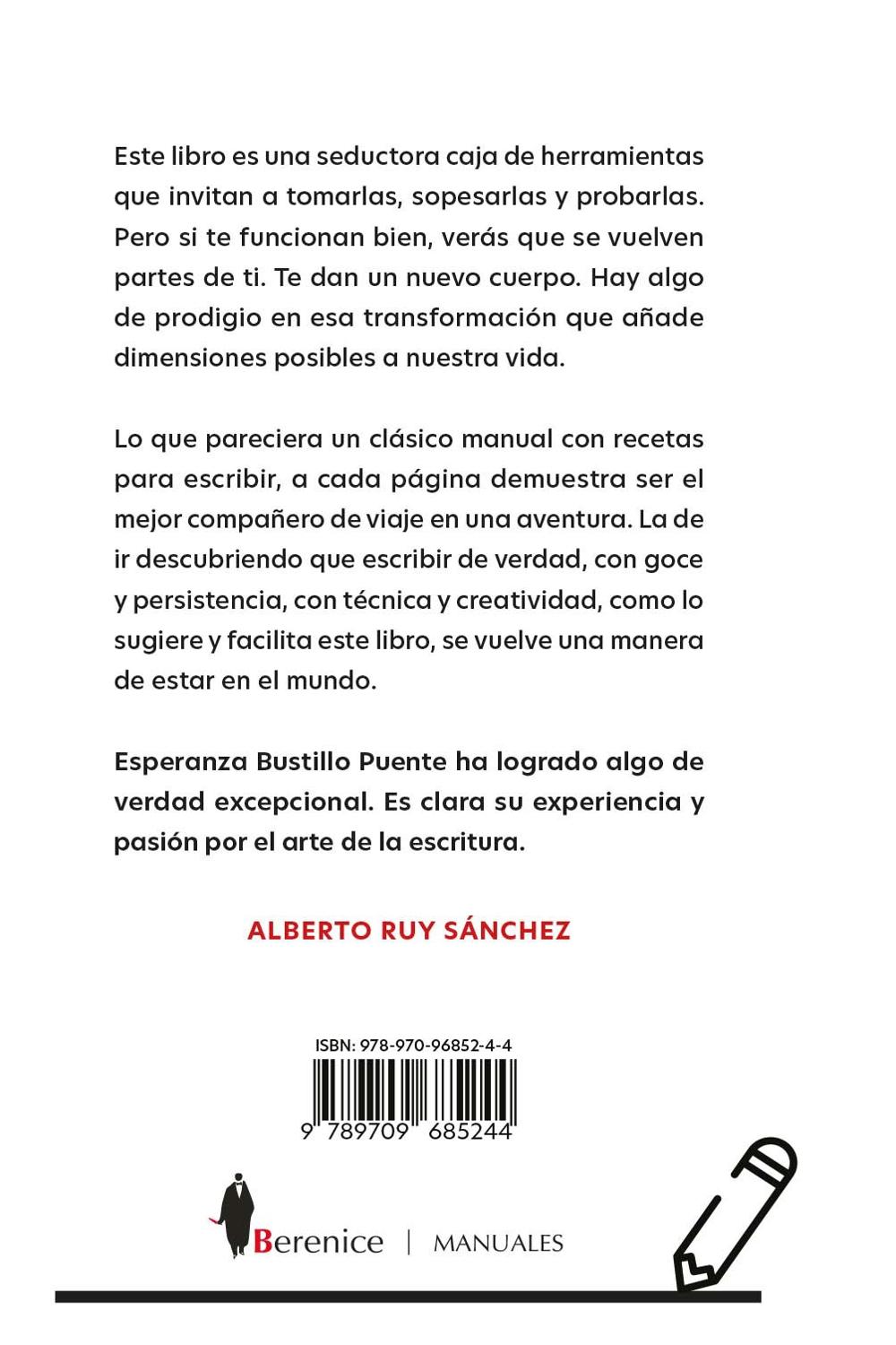 Descripción: La autora, con amplia experiencia en la impartición de talleres de escritura, retoma en esta nueva publicación las herramientas más prácticas y eficaces para toda persona que desee escribir o que ya lo haga, pero no sepa cómo continuar. Con una guía cercana y clara, lleva de la mano al lector para que comience a desarrollar un estilo propio y encuentre esa voz interior que dicta las historias que muchas veces se quedan en la imaginación. El resultado: un texto auténtico e inspirado. Lo que pareciera un clásico manual con recetas para escribir, a cada página demuestra ser el mejor compañero de viaje en una aventura. La de ir descubriendo que escribir de verdad, con goce y persistencia, con técnica y creatividad, como lo sugiere y facilita este libro, se vuelve una manera de estar en el mundo. Prólogo de Alberto Ruy Sánchez.
